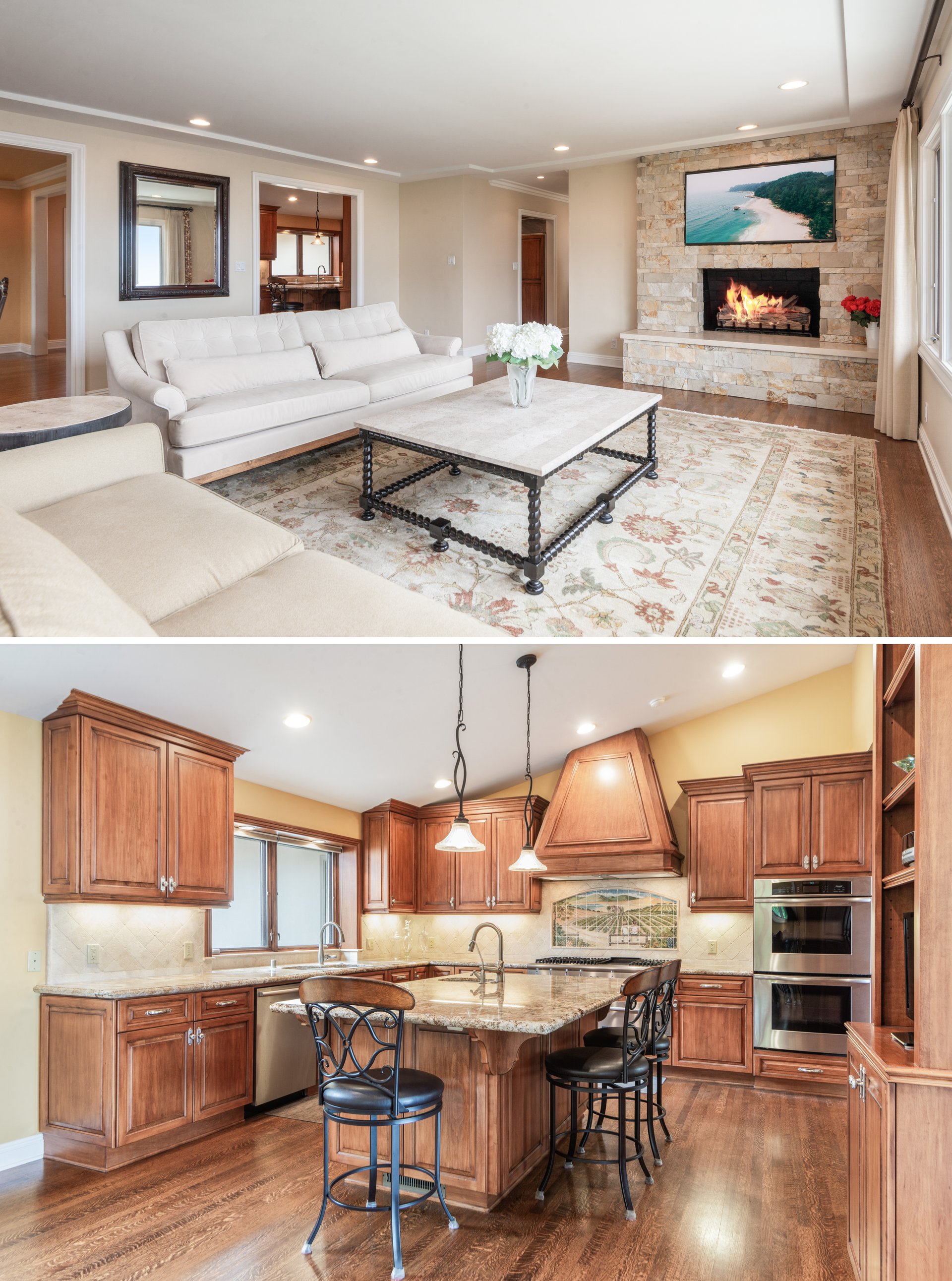 The inviting living room centers around a beautiful fireplace and oversized picture windows that frame the panoramic views. The formal dining room offers an ideal setting for gatherings, while the gourmet kitchen is a chef’s dream, complete with top-of-the-line finishes.