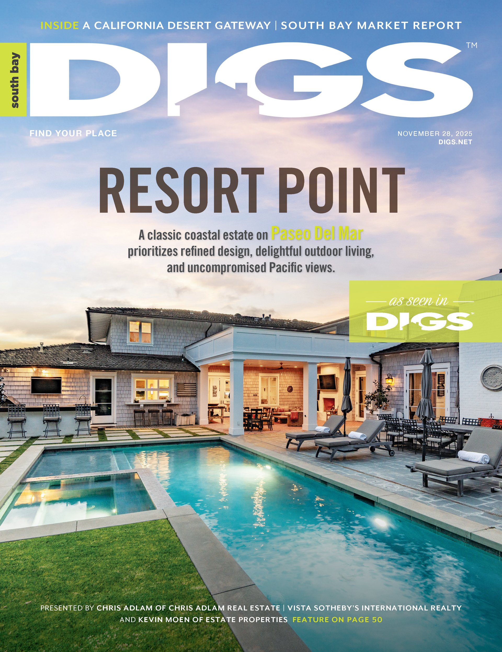 We are thrilled to share that Chris Adlam and his stunning coastal listing at 2736 Paseo Del Mar have just been featured in DIGS Magazine. The article spotlights the home as a “resort style estate overlooking the Pacific,” highlighting its 7,659 square foot shingle style architecture, six bedrooms, chef’s kitchen, private home theater, and resort inspired amenities including a 50 foot lap pool, versatile sports court, and a classic loggia designed for year round entertaining.