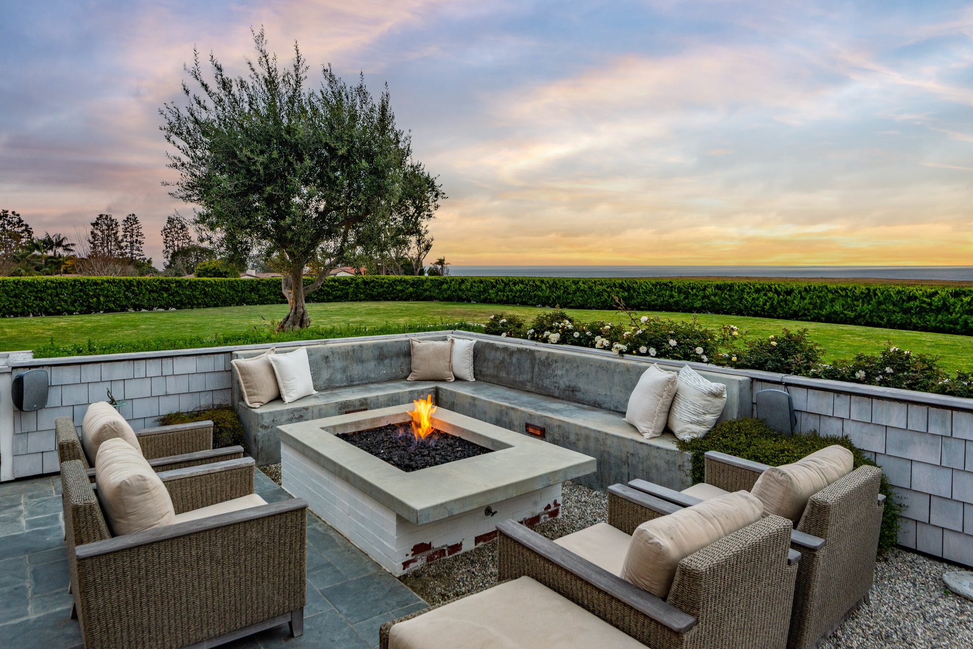 The outdoor spaces feel like a private resort. The hedge lined front lawn features a fire pit tailored for sunset gatherings, while the backyard offers a fifty foot lap pool with spa and Baja shelf, a versatile multi sport court, and an outdoor kitchen with Hestan BBQ and TV. A six hundred square foot loggia with built in heaters, a fireplace, and a large screen television provides year round comfort and a seamless connection to the outdoors.