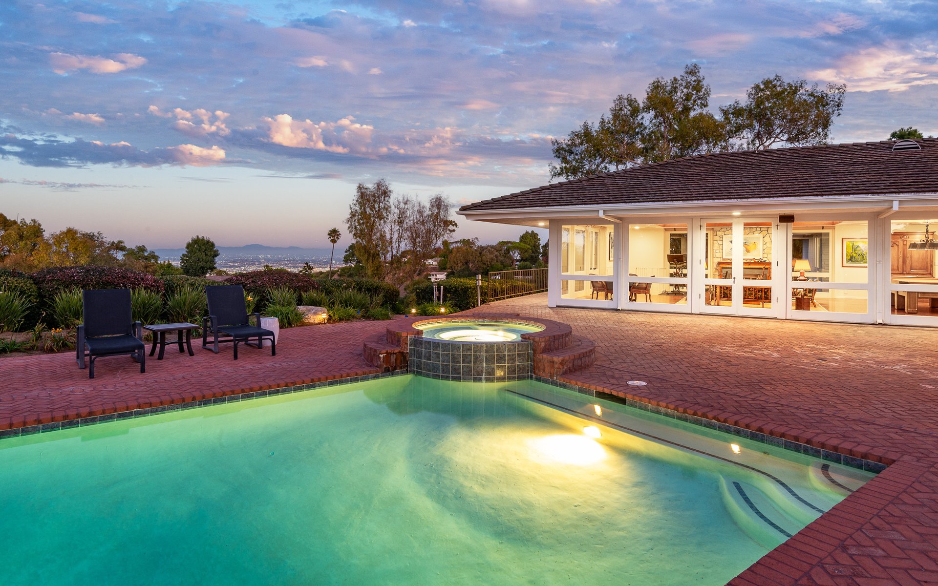 The living room overlooks the rolling front lawn with sweeping vistas of the ocean and Catalina, while the spacious family room opens to the backyard with its dazzling city lights and coastline views beyond.