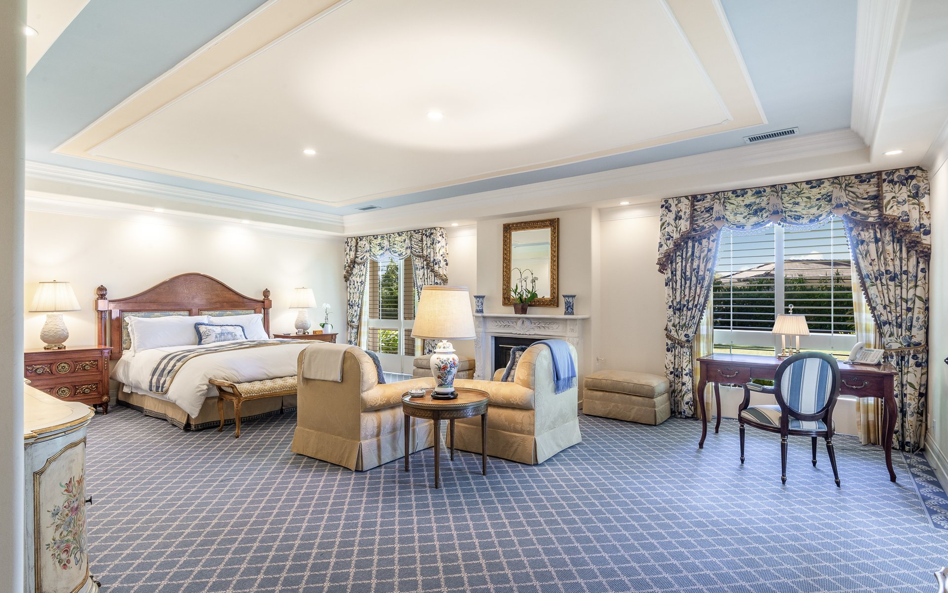 The bedroom wing includes five bedrooms, each with its own full bathroom. The oversized primary suite offers a luxurious sense of space and privacy.
