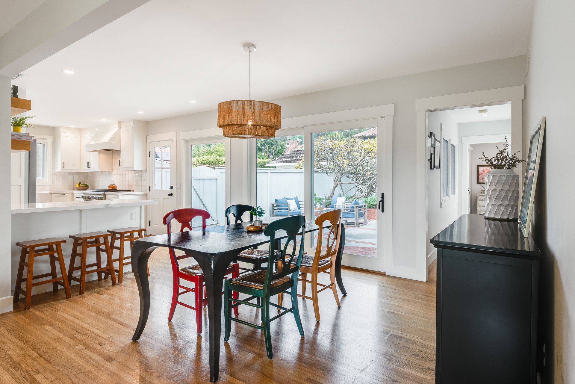 French sliders open to the outdoors, creating a seamless indoor / outdoor flow to a large patio and an expansive grassy backyard.