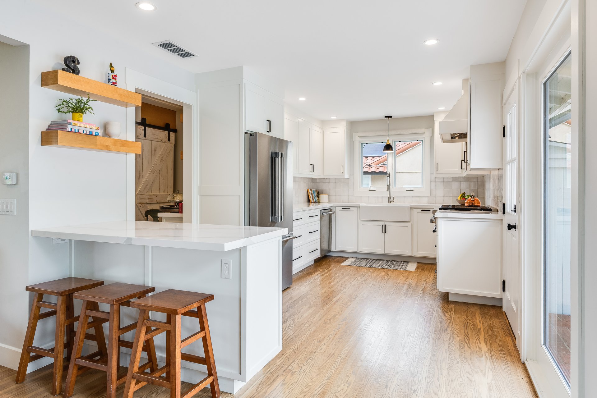 The spacious living room with fireplace anchors the well-designed floor plan, while the beautifully renovated kitchen showcases Thermador appliances, custom cabinetry, and leads to the adjacent bar and laundry room.