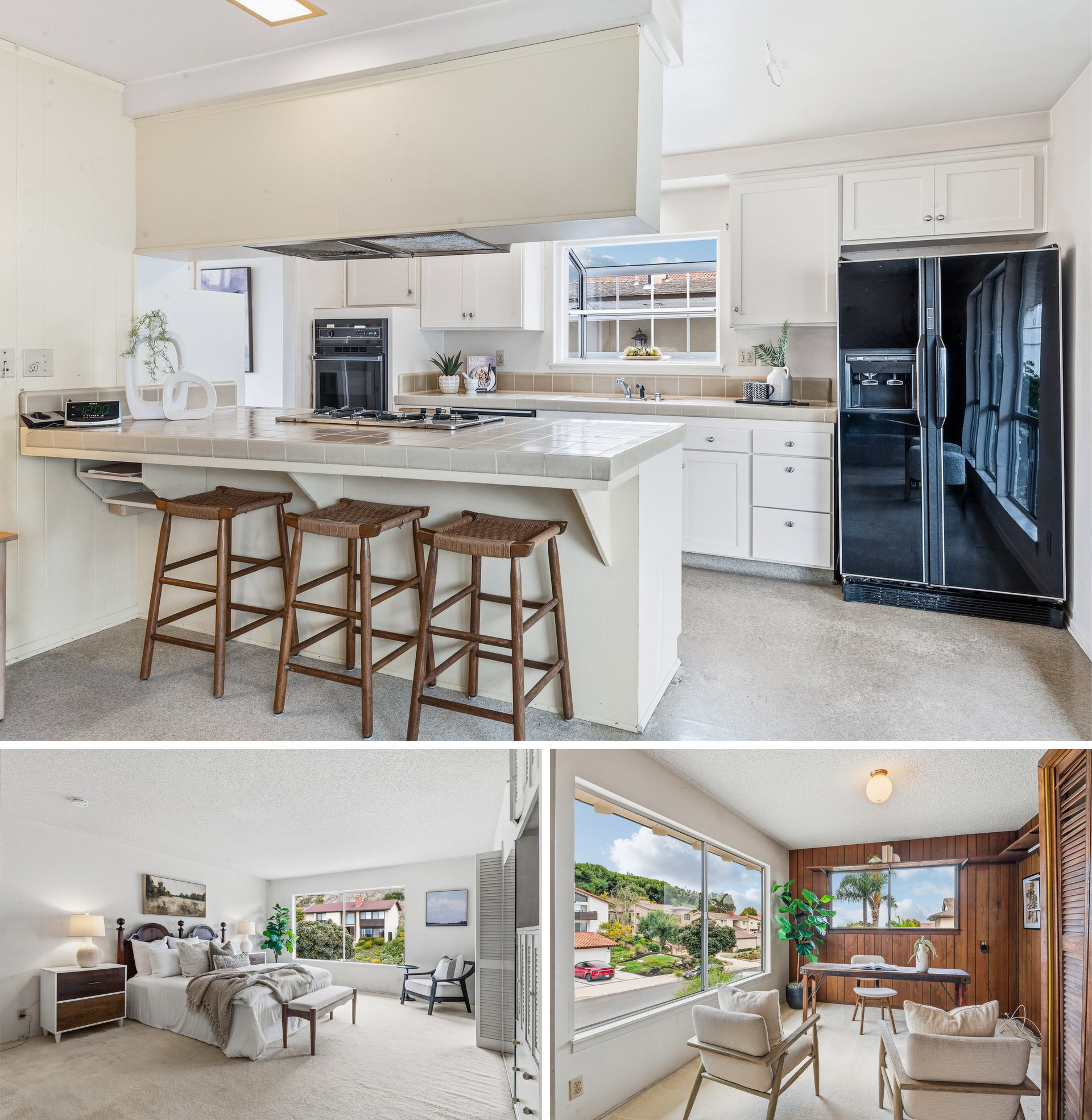 Set on a large lot with panoramic ocean views and endless potential, this property offers the chance to create your forever home. The spacious living room, complete with a warm fireplace and beautiful ocean and sunset views, flows naturally into the formal dining room.