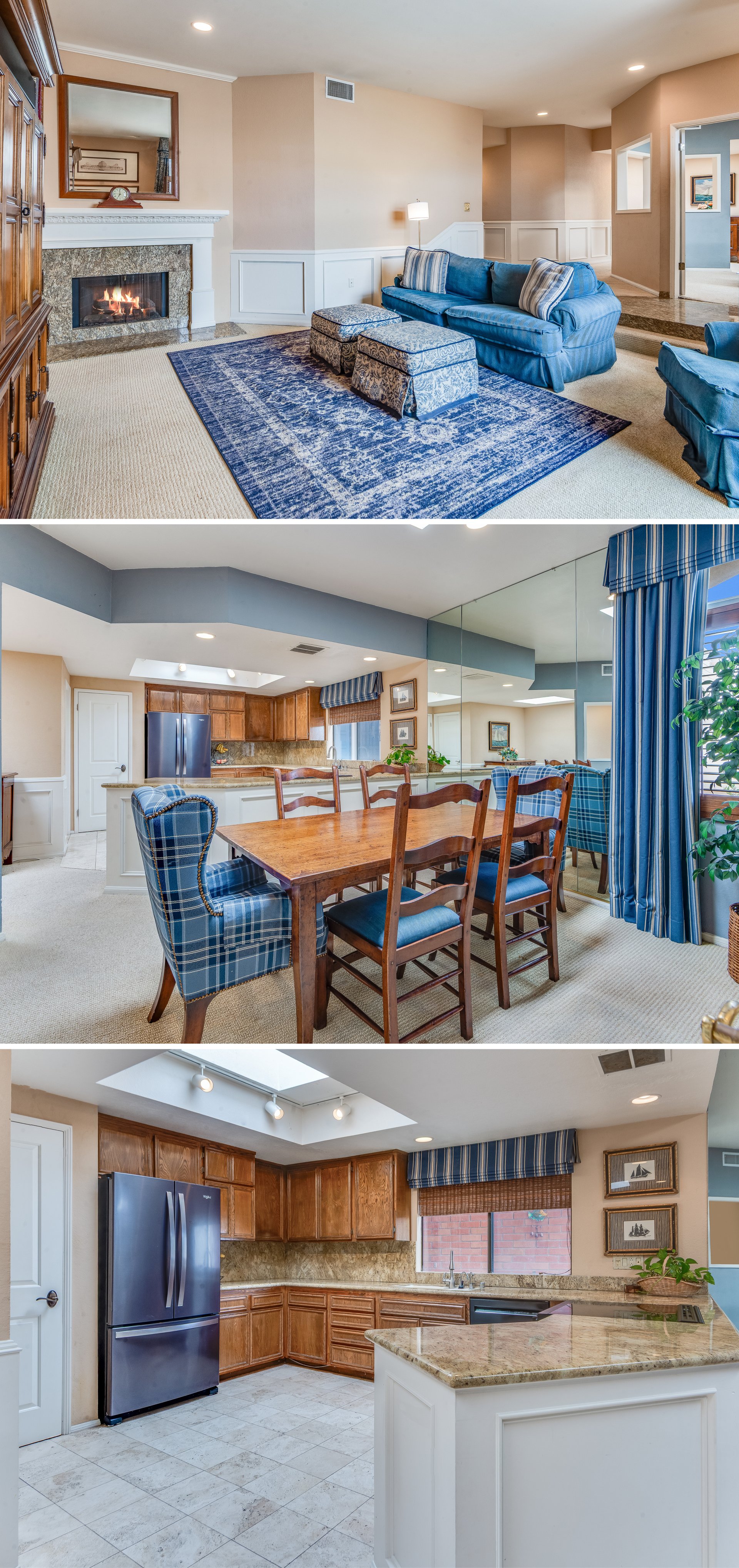This light-filled home features a large living room with soaring ceilings, elegant wainscoting, and an inviting fireplace, perfect for cozy evenings or entertaining guests. The spacious formal dining area flows seamlessly into an expansive kitchen with granite countertops and an adjacent laundry room for added convenience.