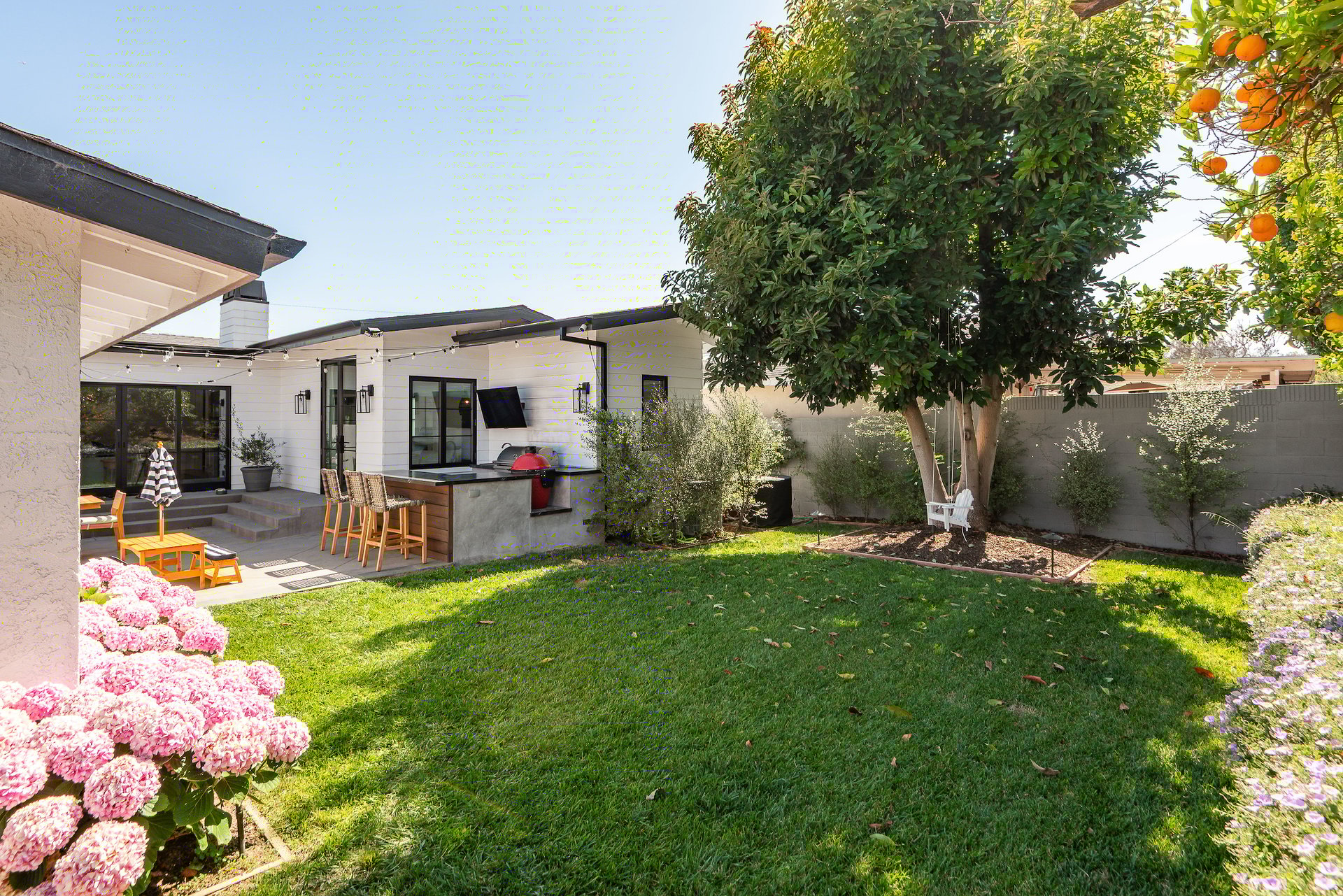 A gated driveway leads to the detached garage and a spacious, grassy backyard with prolific fruit trees, and an outdoor kitchen equipped with quartzite countertops, built-in grill, sink, and trash enclosure.