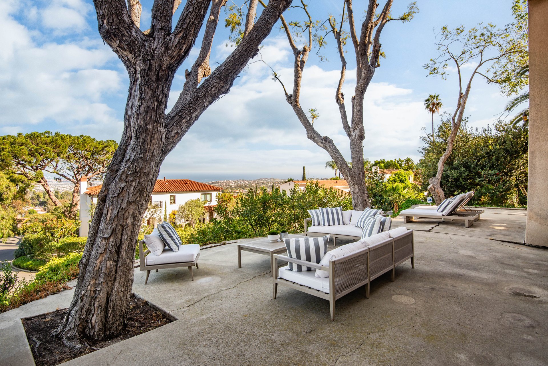 Multiple French doors open to a broad terrace stretching across the front of the home, creating effortless indoor-outdoor living. This expansive space is perfectly positioned to enjoy the sweeping coastal panorama and sparkling harbor lights beyond, making it ideal for both relaxing and entertaining.