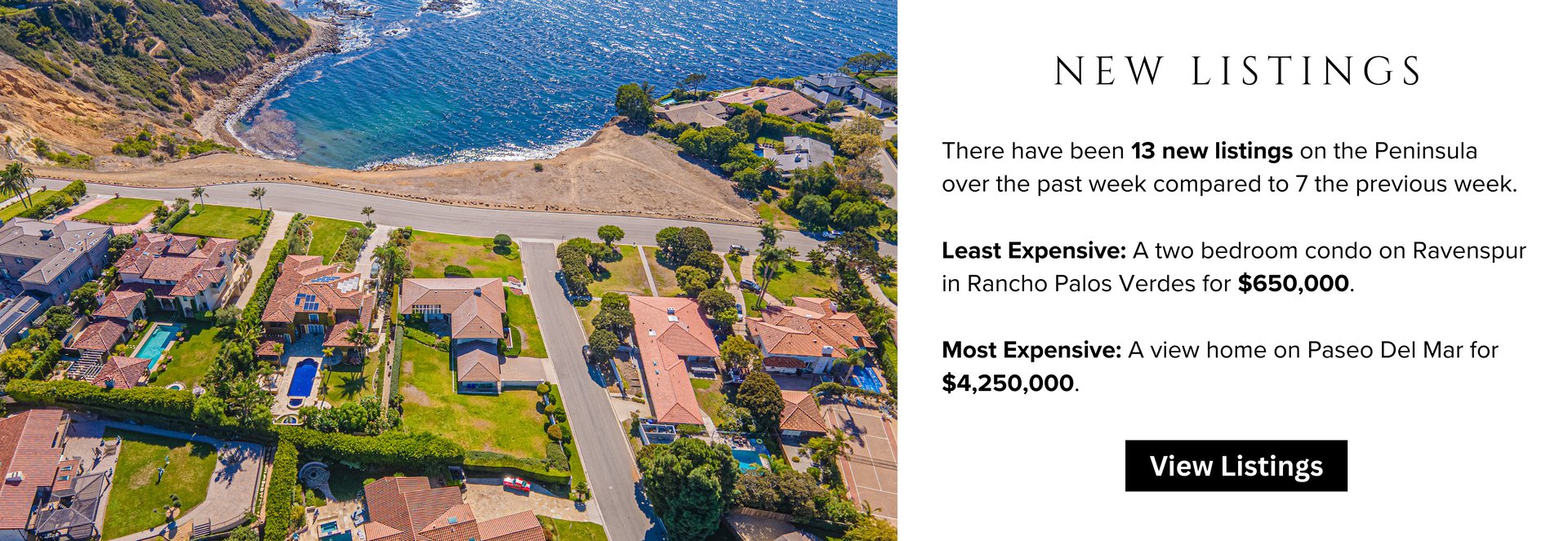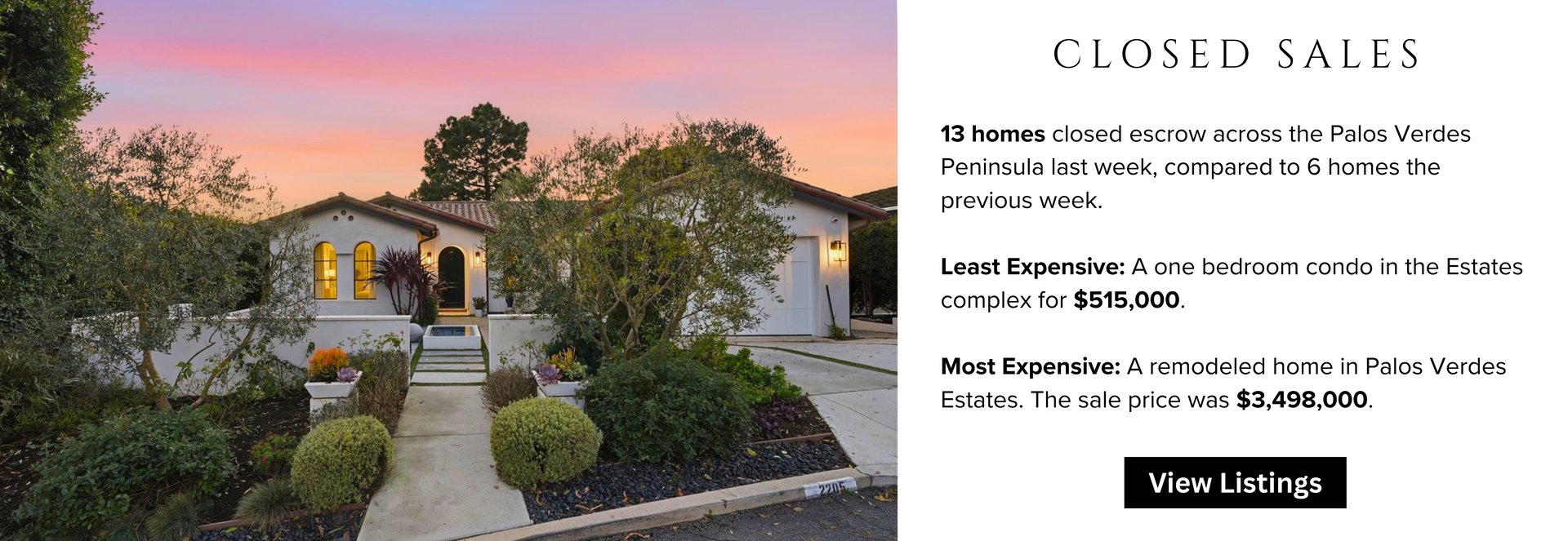 Buyer and seller activity remained steady across the Palos Verdes Peninsula this past week, with increases in both new listings and closed sales. Inventory expanded, while homes continued to move through escrow and into closing, reflecting continued engagement across multiple price points. Below is a snapshot of last week’s market activity, including new listings, pending sales, closed transactions, and this week’s House of the Week.