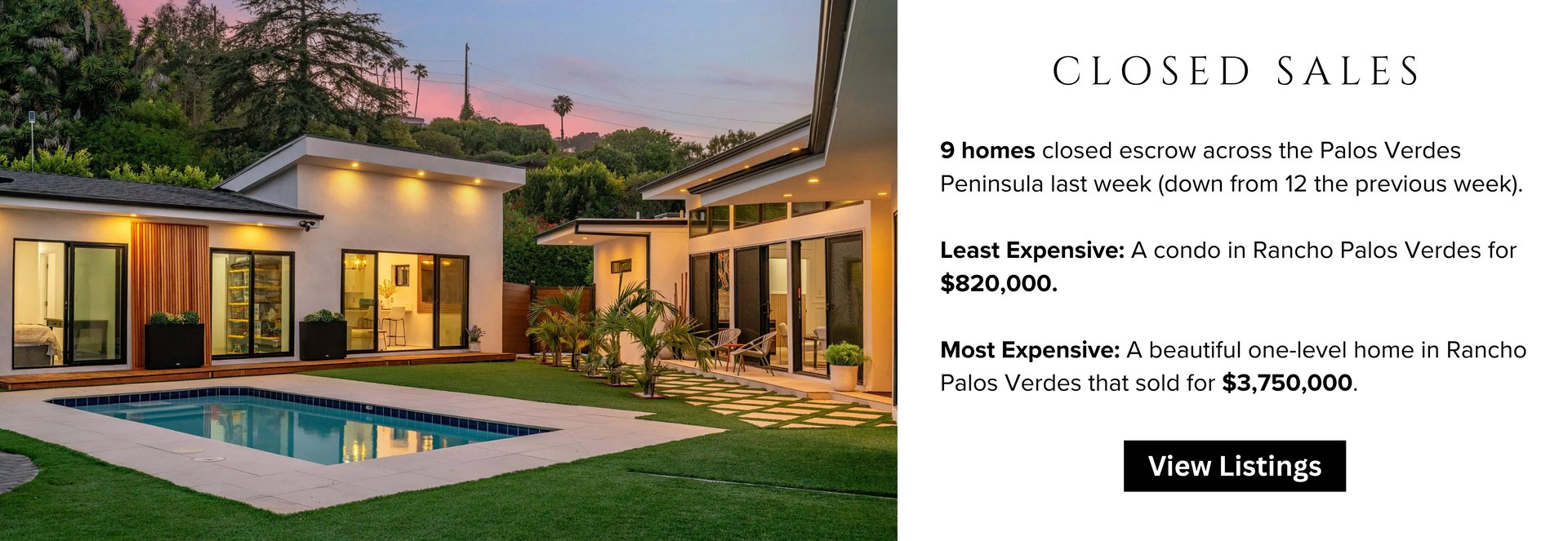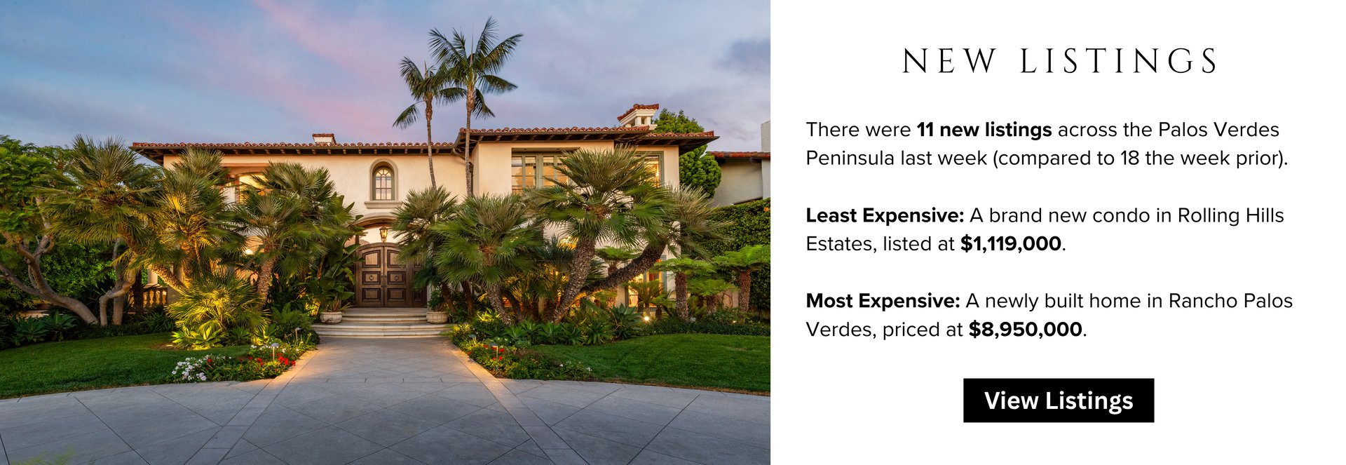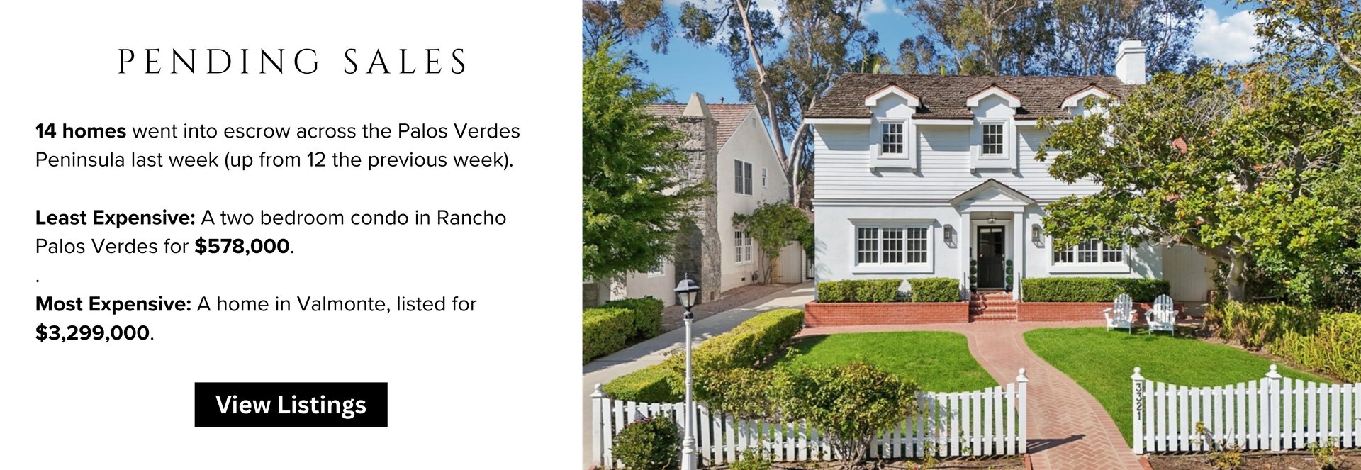 The Palos Verdes real estate market continues to show steady activity this week, with a balanced mix of new listings, pending escrows, and closed sales across the Peninsula. From brand-new construction in Rolling Hills Estates to coastal estates in Lunada Bay, the market remains active across all price points.