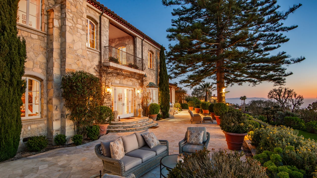 This remarkable estate evokes the charm and elegance of a Provencal country home while showcasing breathtaking panoramic ocean views. With its timeless stone facade and exceptional craftsmanship, old-world character seamlessly blends with modern comfort. Inside, oversized rooms, vaulted ceilings, intricate woodwork, and expansive windows create a light-filled interior that frames the spectacular coastal vistas. Situated on more than an acre and a half of prime view property in the heart of Palos Verdes Estates, the grounds combine lush landscaping with extensive stonework to capture the spirit of a French countryside retreat. An expansive terrace invites relaxed outdoor living while enjoying the coastal breezes and sweeping views. The attached guesthouse features a private entrance and includes one bedroom, one-and-a-half baths, a living room, and kitchen. It's perfect for guests, extended family, or flexible living arrangements. The inviting pool, adjacent pool house, and secluded spa are surrounded by beautifully manicured gardens, an orchard, and a putting green. Whether entertaining on a grand scale, spending time with family, or enjoying a quiet sunset overlooking the ocean, this exceptional property offers a rare blend of elegance, privacy, and panoramic views.