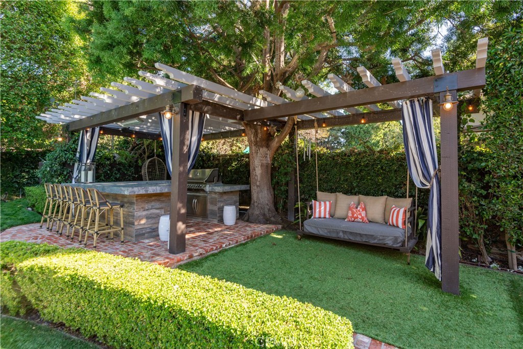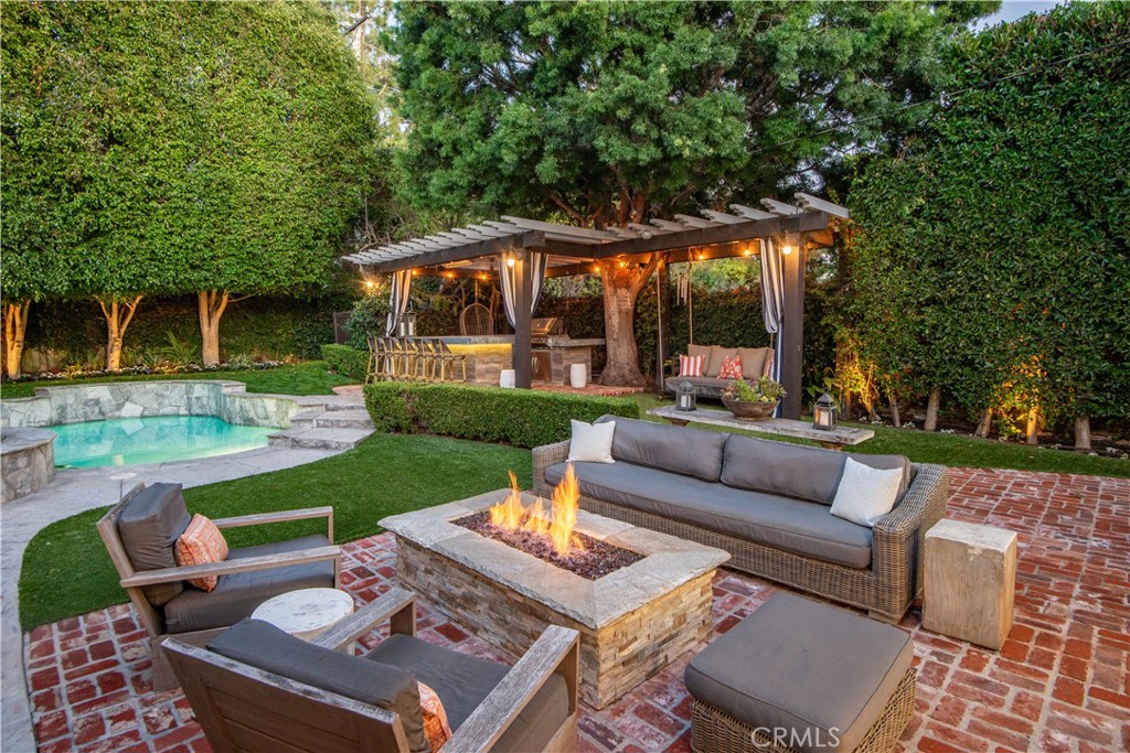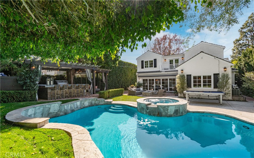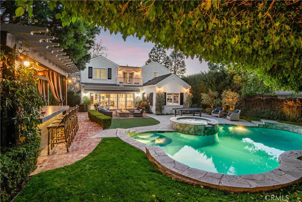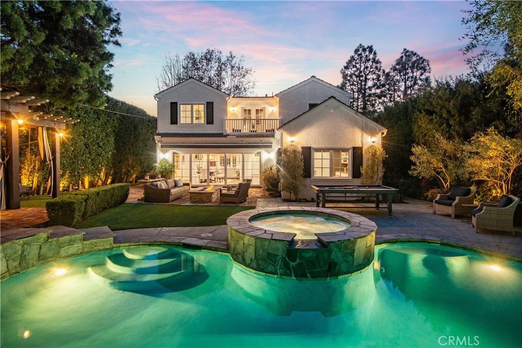 Incredible Coastal Cape Cod in the heart of lower Lunada Bay with the famous red door! From the minute you arrive, the charm and character is abundant. The entry level includes an inviting living room with bay window and roaring fireplace, a formal dining room, a spectacular kitchen with center island and an adjacent family room set up as a cozy media room. There's even a guest bedroom with private bathroom on the entry level. Cascading LaCantina doors provide a 16 foot passageway to the lushly landscaped, resort-like backyard, complete with fire pit, outdoor kitchen, as well as a sparkling pool & spa; it's spectacular! Upstairs, you'll find 4 bedrooms, (one being used as an office) including an oversized primary suite with vaulted ceiling, walk-in closet and luxurious bathroom. Used brick accents, hardwood floors, wainscoting, crown molding, air-conditioning, and so much more. Conveniently located just blocks from Lunada Bay Elementary, Palos Verdes Intermediate and PV High School, as well as Lunada Bay Plaza, this house has it all!