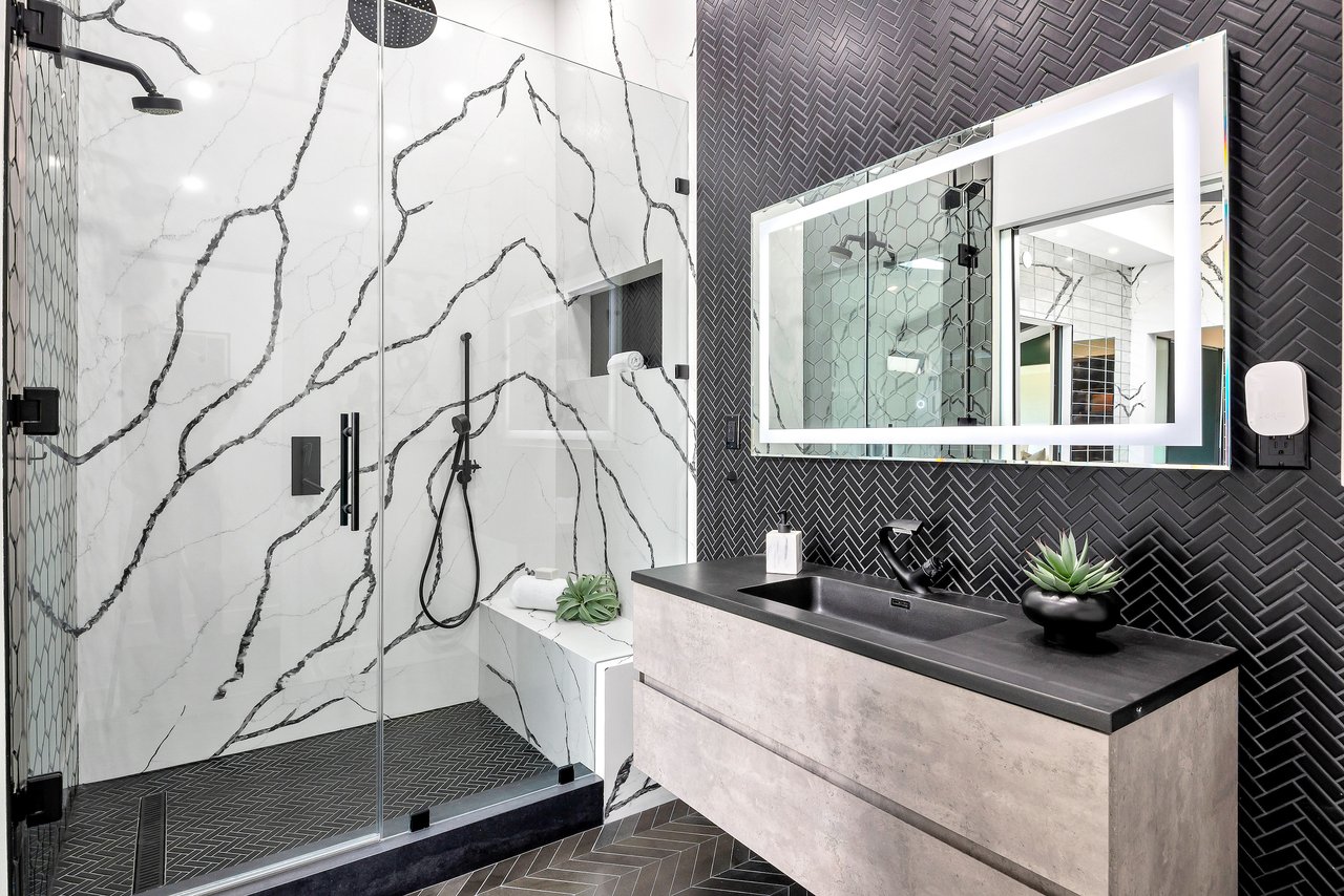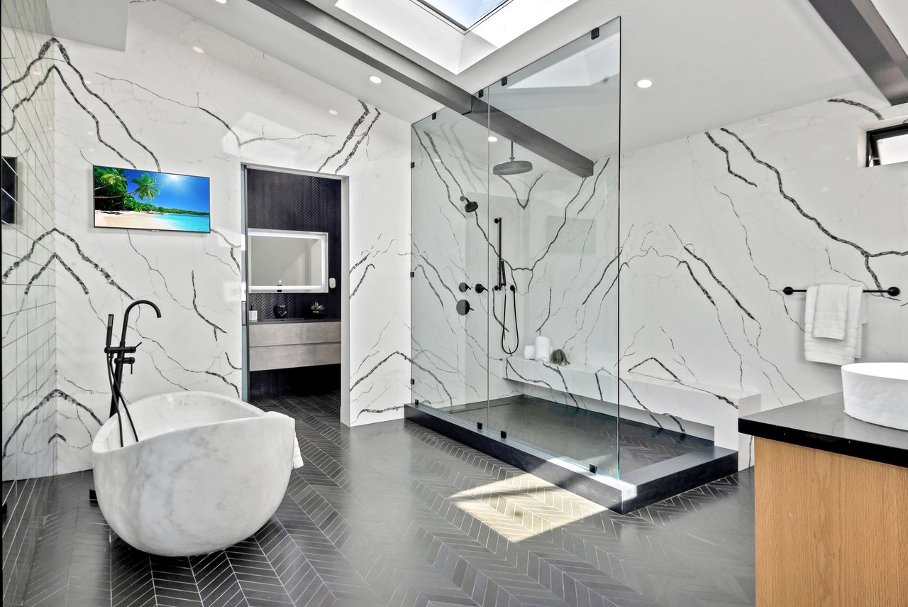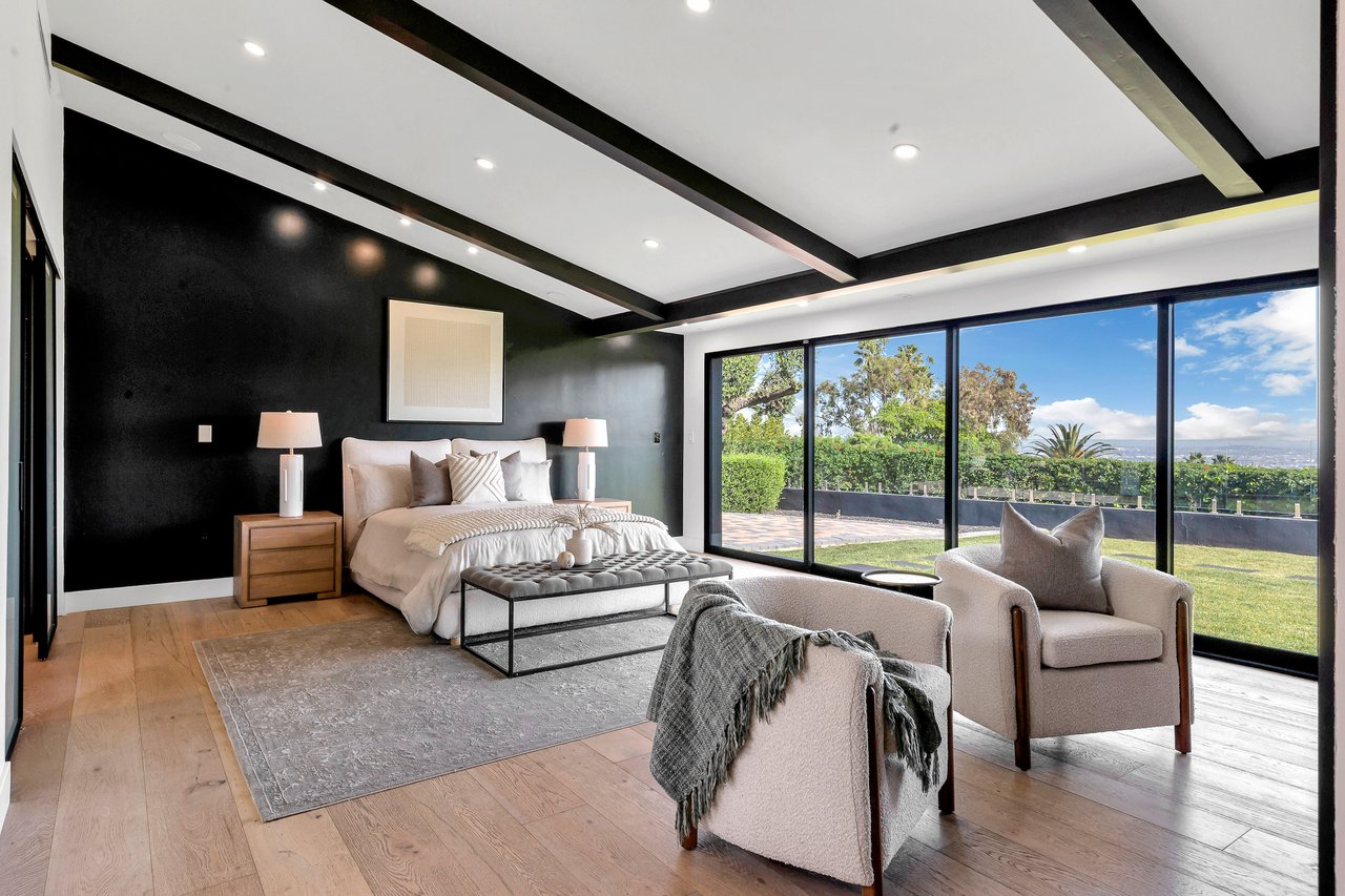Private and gated, this reimagined single-story home sits on over half an acre, capturing spectacular harbor, city, and ocean views that unfold the moment you arrive. Beautifully renovated with an emphasis on sophistication and quality, the home features new electrical, plumbing, HVAC, Milgard/Western windows, Tesla solar, and two EV chargers. Modern systems supporting timeless design. An oversized glass pivot door opens to a light-filled, open floor plan where wide-plank hardwood floors, floor-to-ceiling sliders, and a striking two-way glass fireplace compliment the ever-changing views. Just beyond the walls of glass, a sprawling grassy play yard stretches out, ideal for children, pets, and relaxed outdoor gatherings, creating a seamless indoor-outdoor flow. The chef's kitchen anchors the space with black-and-white Dalmatian marble, a generous island, Rohl fixtures, and a full suite of Viking appliances including a 6-burner range, double ovens, Sub-Zero refrigerator, and dual dishwashers. Two separate bedroom wings offer privacy and flexibility. The harbor-view primary suite is a retreat of its own, featuring a fireplace, vaulted beams, spa-style bath with soaking tub and skylight, and a custom walk-in dressing room. The secondary wing provides four additional bedrooms or adaptable office and gym space. A large laundry room with dual Samsung washer/dryer sets adds everyday convenience. The detached 540+- sq ft ADU has a bedroom, kitchen/dining area, and mini-split HVAC offering ideal space for guests, multigenerational living, or rental use. A rare combination of privacy and views, this turn-key home offers a refined yet relaxed coastal lifestyle.