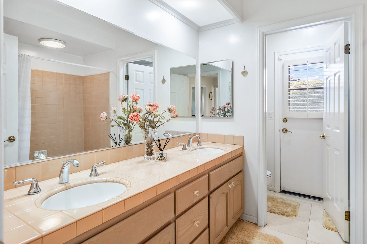 At the center of the home, the spacious kitchen boasts dual dishwashers, ovens, and microwaves, along with a large center island and sunny breakfast nook. The adjacent family room, complete with a fireplace and wet bar, creates the perfect hub for entertaining. A formal living room with wood-burning fireplace and an elegant dining room overlook the lush backyard, offering both warmth and sophistication.