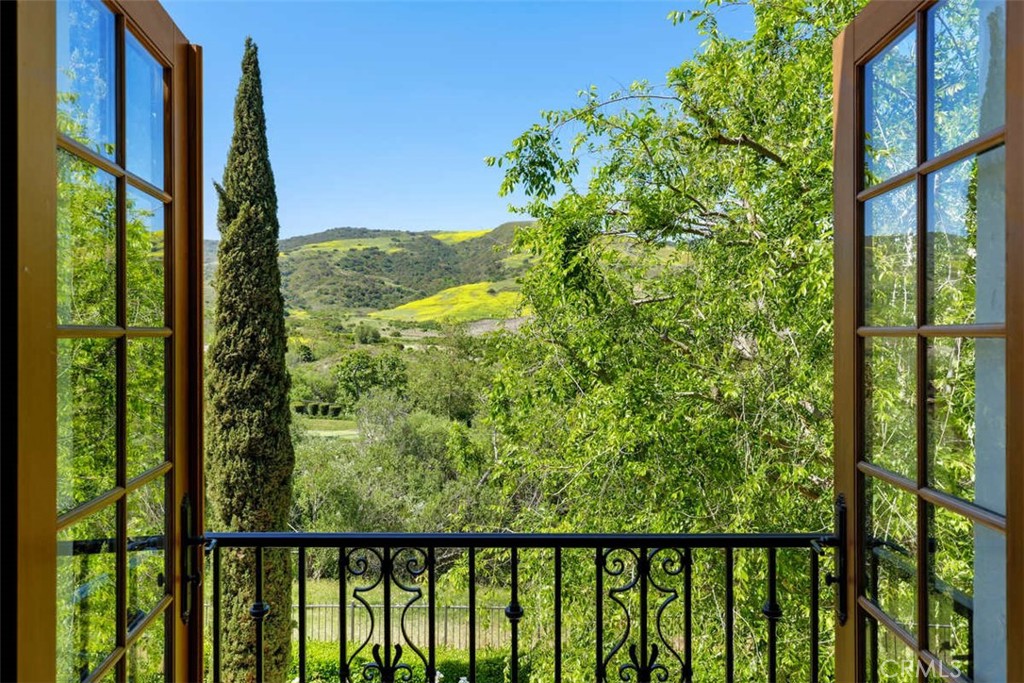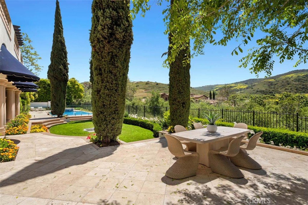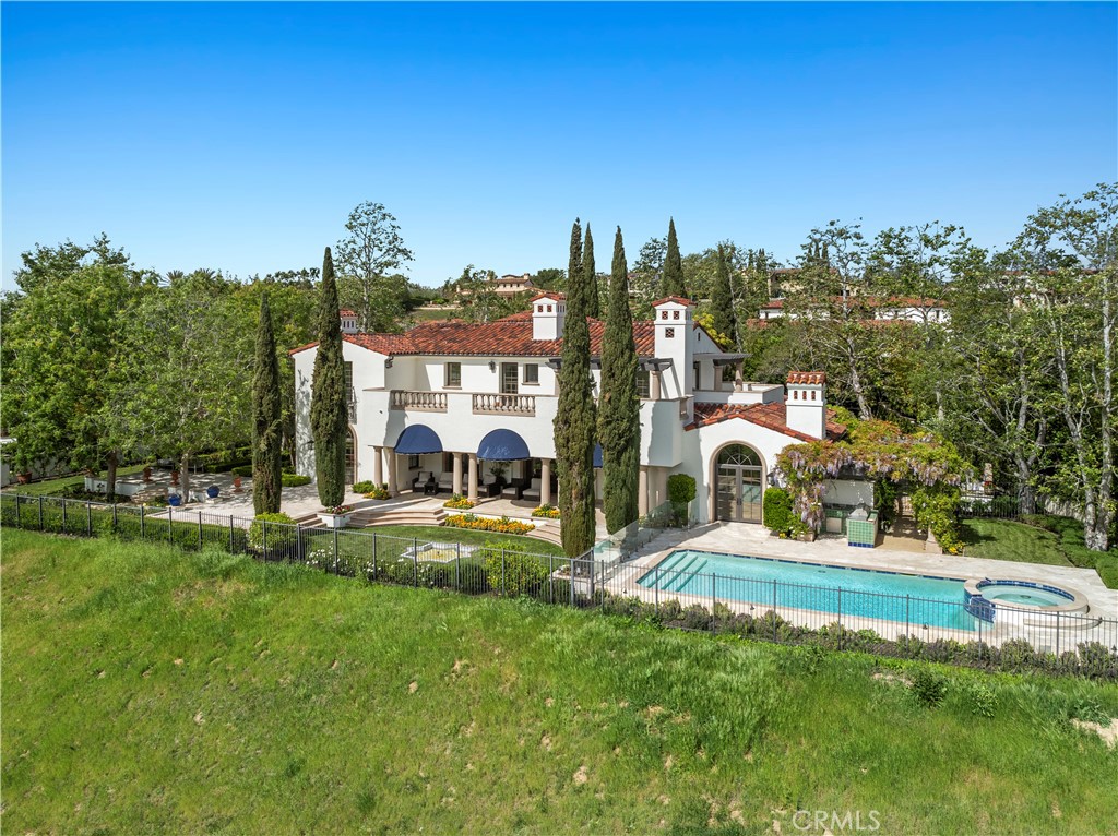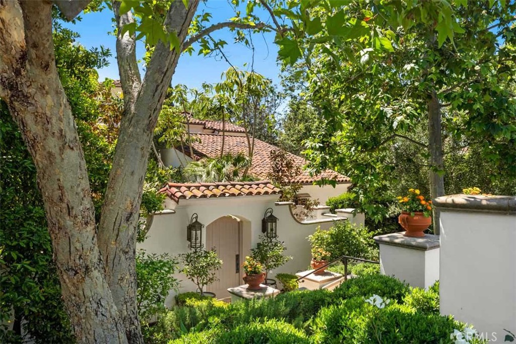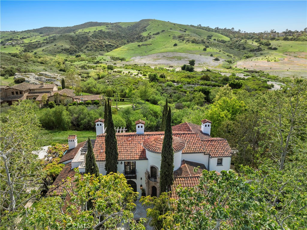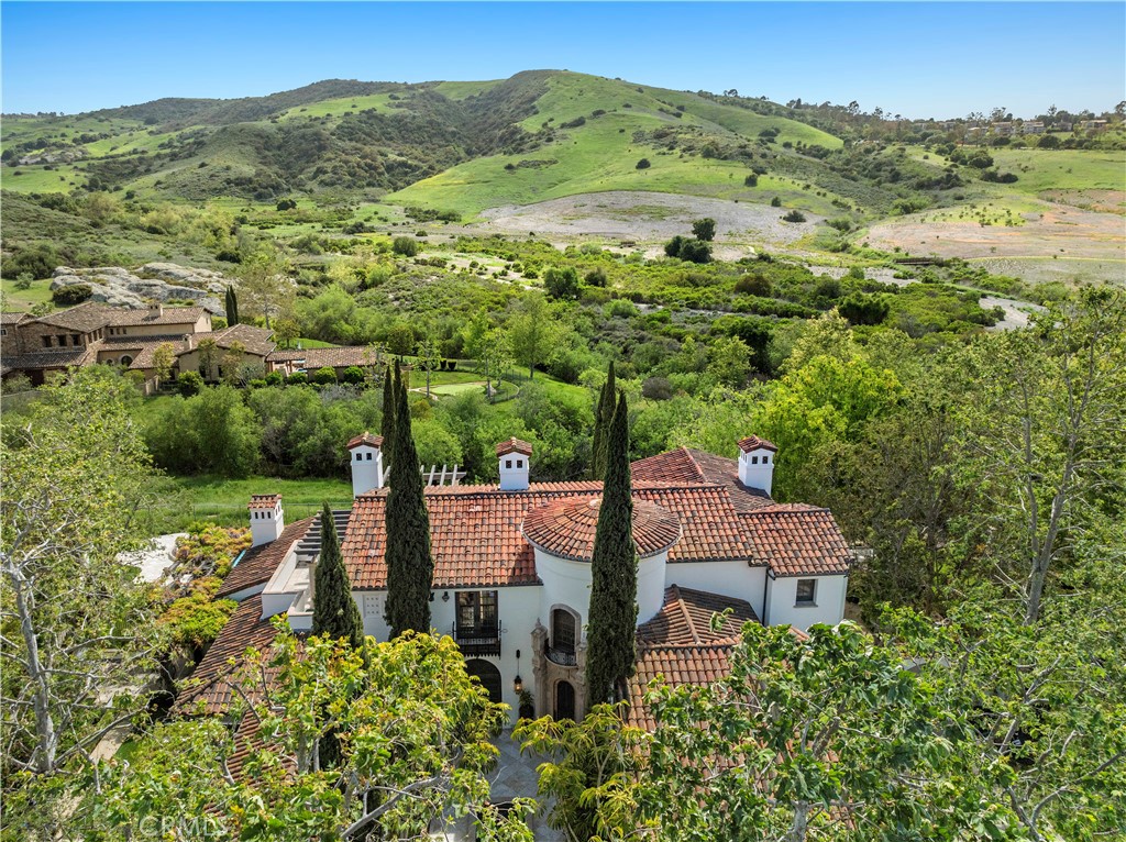 Reminiscent of the timeless villas along the Mediterranean coast, this front-row custom estate in Shady Canyon has been beautifully renovated to blend classic architecture with sophisticated, modern living. Set against the breathtaking backdrop of Bommer Canyon, the home offers an incredible 200 feet of sweeping scenic views-creating a private sanctuary designed for refined living and grand entertaining. From the sparkling pool and spa to the lush emerald lawn and multiple al fresco dining areas, every outdoor space is designed for year-round enjoyment. Framed by forever views from nearly every vantage point, this residence invites you to exhale and stay awhile. Step inside to a dramatic double-height foyer where arched hallways and custom wrought-iron railings frame a graceful, curved staircase. Natural light floods the interiors, drawing the eye to garden views beyond and setting the tone for the elegance found throughout. Spanning approximately 7,746 square feet across three levels-with convenient elevator access-the 5-bedroom, 7-bath estate showcases a serene neutral palette and wide-plank European oak flooring, creating a sense of cohesion and effortless elegance. The newly remodeled open-concept kitchen is the heart of the home, featuring designer cabinetry, premium appliances, and a large center island. It opens seamlessly to the family room and out to the backyard, where glass doors invite in light and canyon views-perfect for indoor-outdoor living and family gatherings. Upstairs, three spacious bedrooms include a serene primary suite with a private terrace, sitting area, and spa-inspired bath featuring dual vanities, a soaking tub, and walk-in marble shower. All baths have been recently reimagined with boutique hotel-level finishes and fixtures. The lower level is an entertainer's dream-offering a game and media lounge with coffered ceilings, custom cabinetry, a built-in bar, and plush seating with a full projection screen for movie nights. Outside, the spirit of the Mediterranean continues with vine-draped loggias, a central courtyard with tiled fountain, and lush landscaping. Enjoy a built-in BBQ, pool, and spa-set against the undisturbed beauty of Bommer Canyon. Shady Canyon offers two 24-hour guard gates, clubhouse, swim, pickleball, tennis, hiking/biking trails, playground, and a world-class Golf Club.