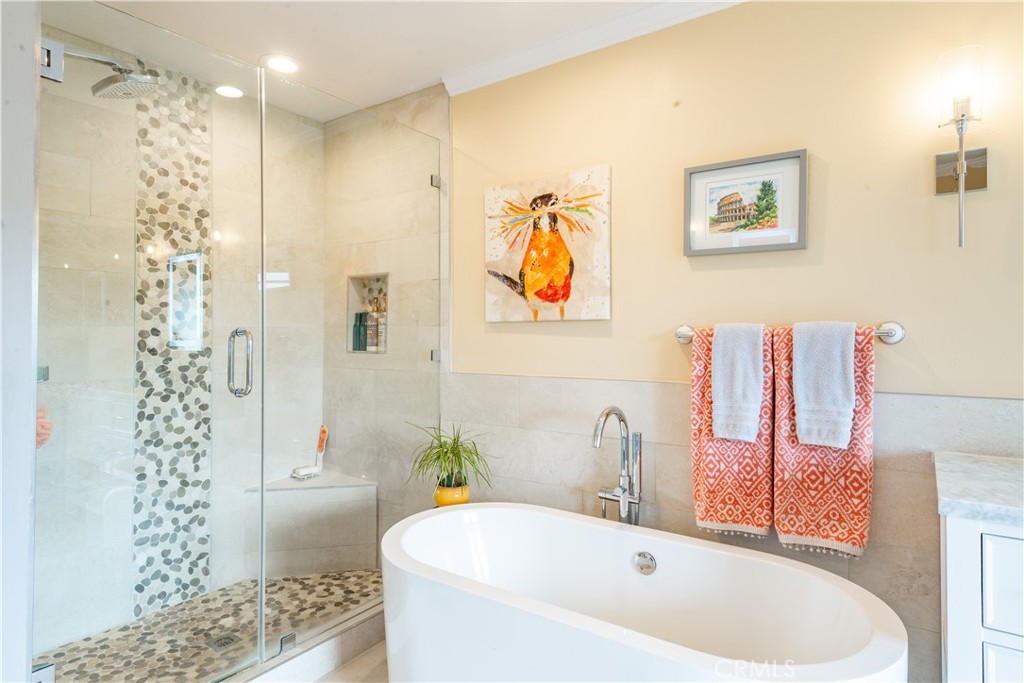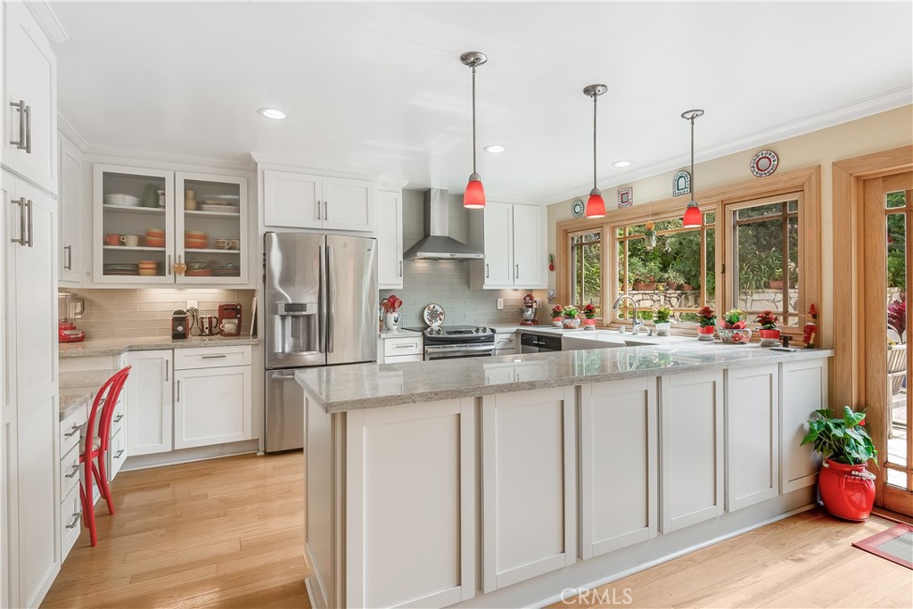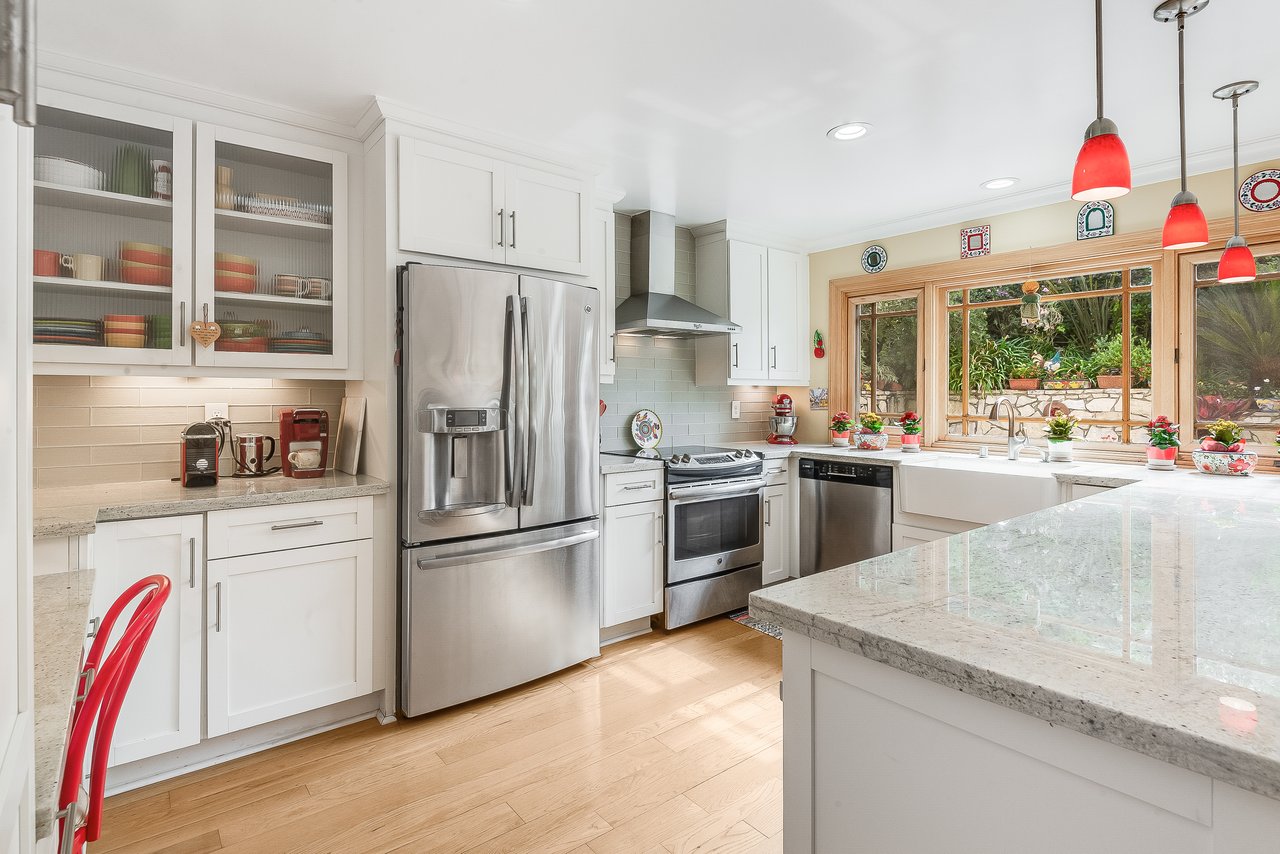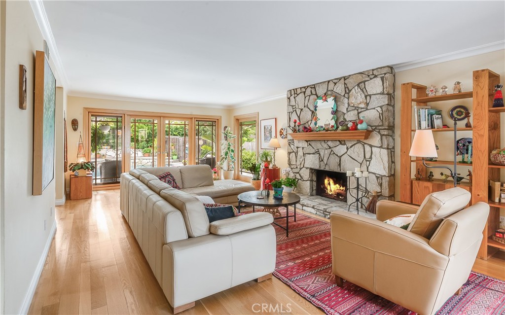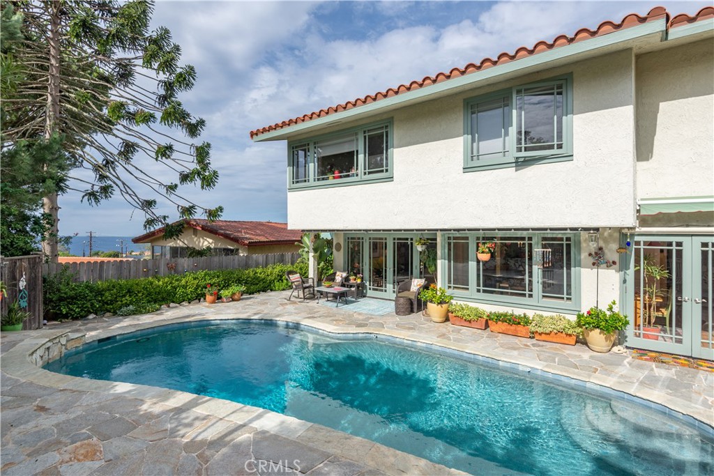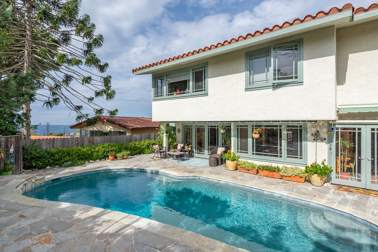Every drive home begins with expansive ocean views, and as you pull into the driveway, you're welcomed by charming curb appeal. Inside, warm hardwood floors paired with wood doors and beautiful windows create a bright, modern aesthetic with a sleek sensibility including clean lines, natural textures, and effortless comfort. The spacious living room centers around a Palos Verdes stone fireplace and opens through French doors to the backyard, creating a seamless indoor-outdoor flow. An adjacent formal dining room is ideal for both everyday meals and special gatherings. The light-filled, updated kitchen features granite countertops, new cabinetry, and direct access to the backyard. Completing the circular lower level is a spacious family room, offering a relaxed retreat. Upstairs, five bedrooms include an oversized primary suite with a luxurious bathroom. Outside, enjoy a private backyard oasis with sparkling pool, lush landscaping, and stone decking; it's your own serene escape. Additional highlights include central A/C, upgraded electrical and plumbing, and inspiring ocean views. Located just moments from top schools, shopping and Hesse Park, this thoughtfully updated home blends timeless comfort with modern simplicity, truly a home that has it all.