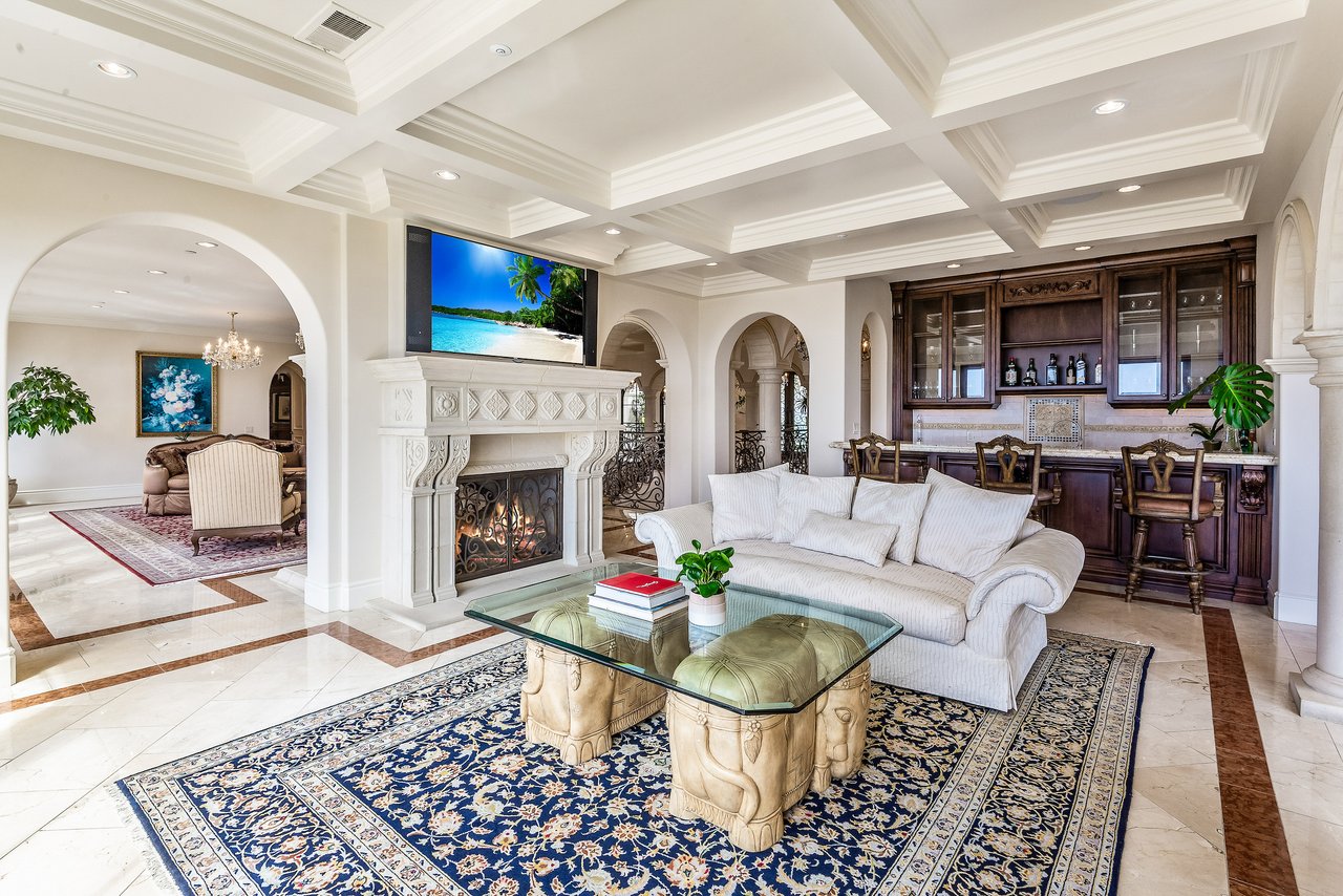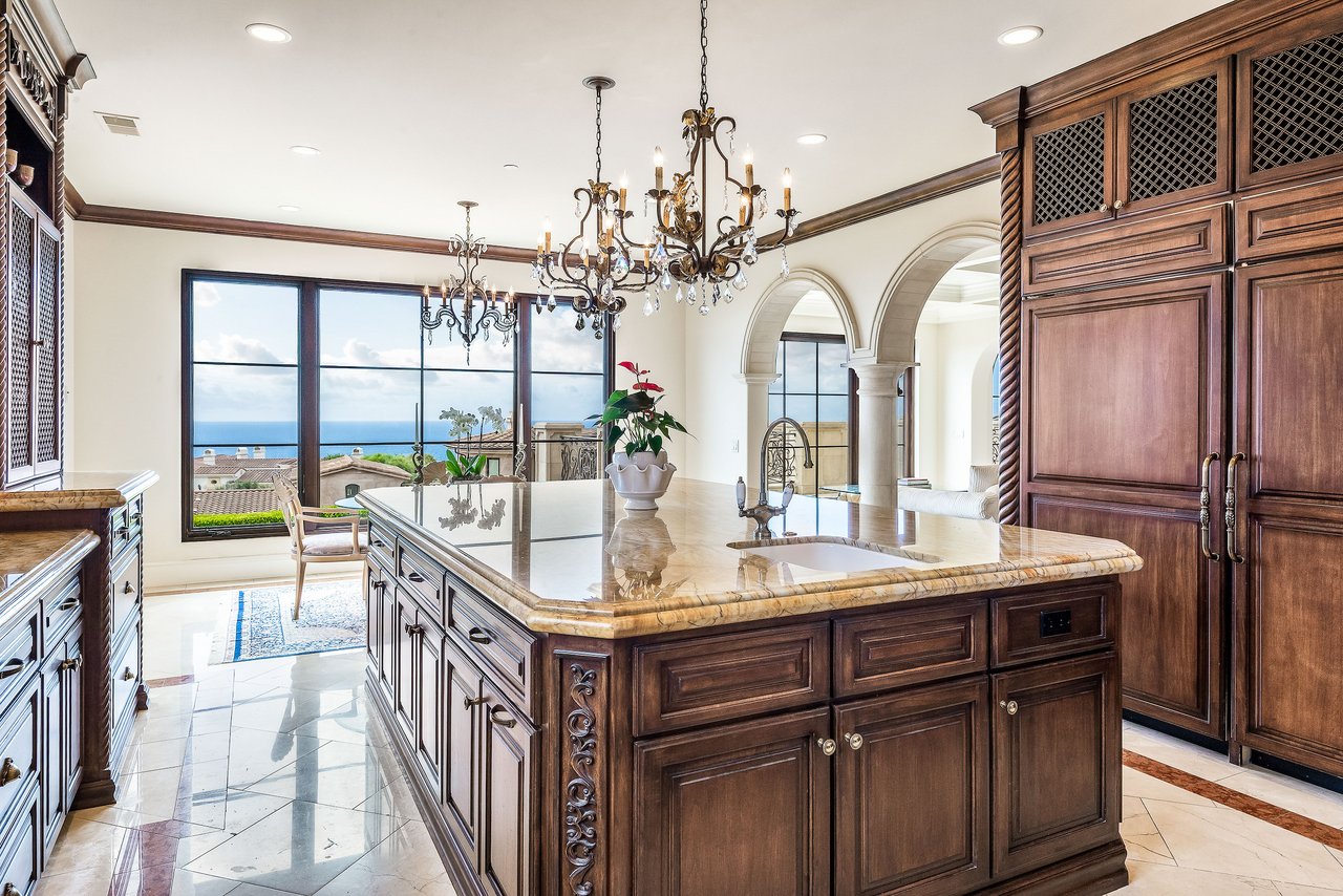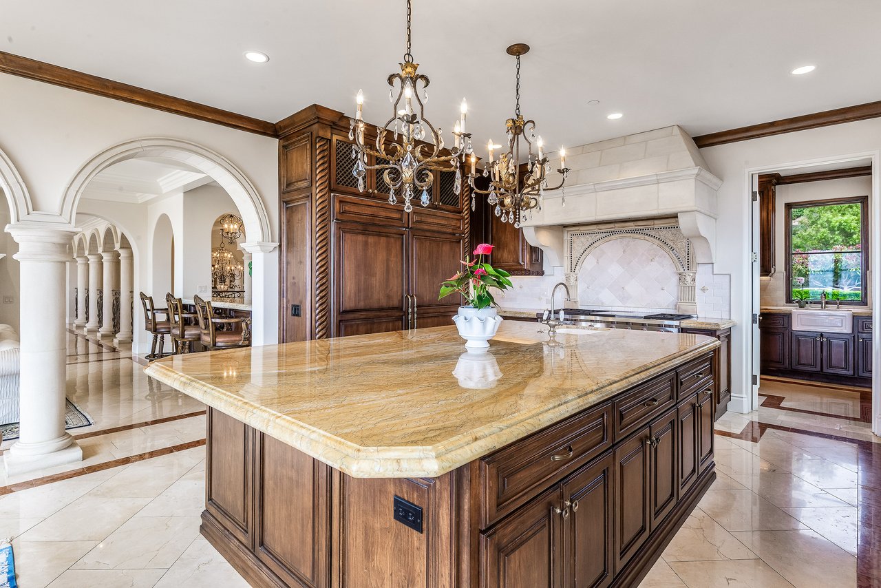 The main level offers effortless single-level living with no steps and includes the impressive primary suite with a huge walk-in closet and spa-like bathroom, a handsome library, gracious living and family rooms, and a chef's kitchen anchored by a spectacular marble island and supported by an adjacent catering kitchen.
