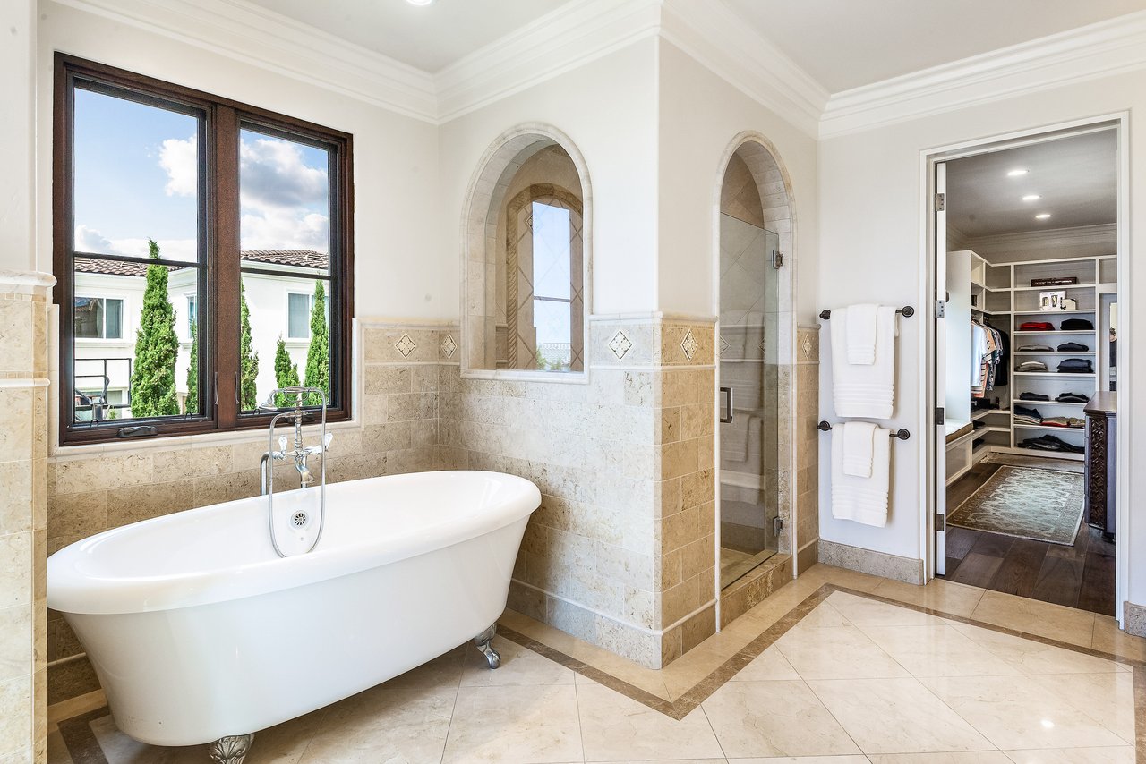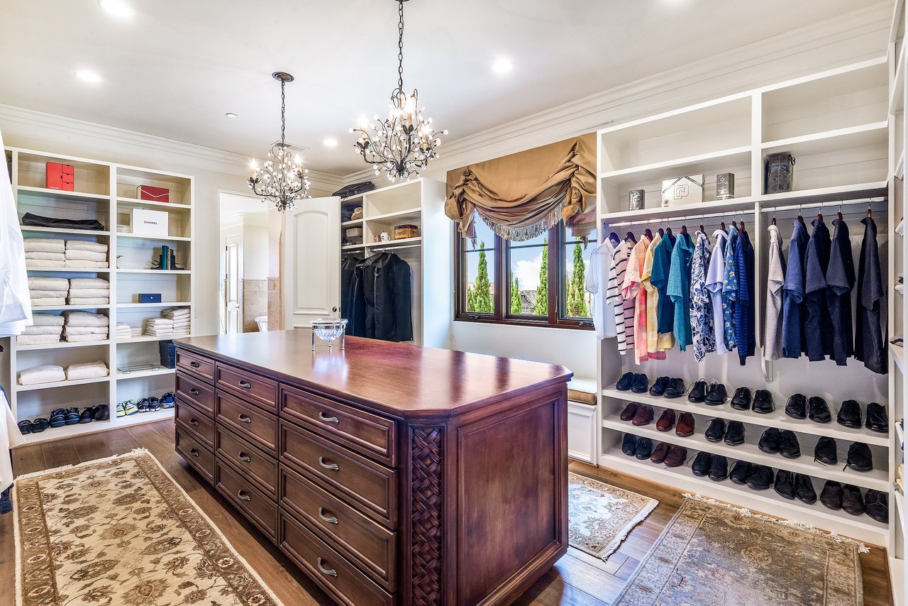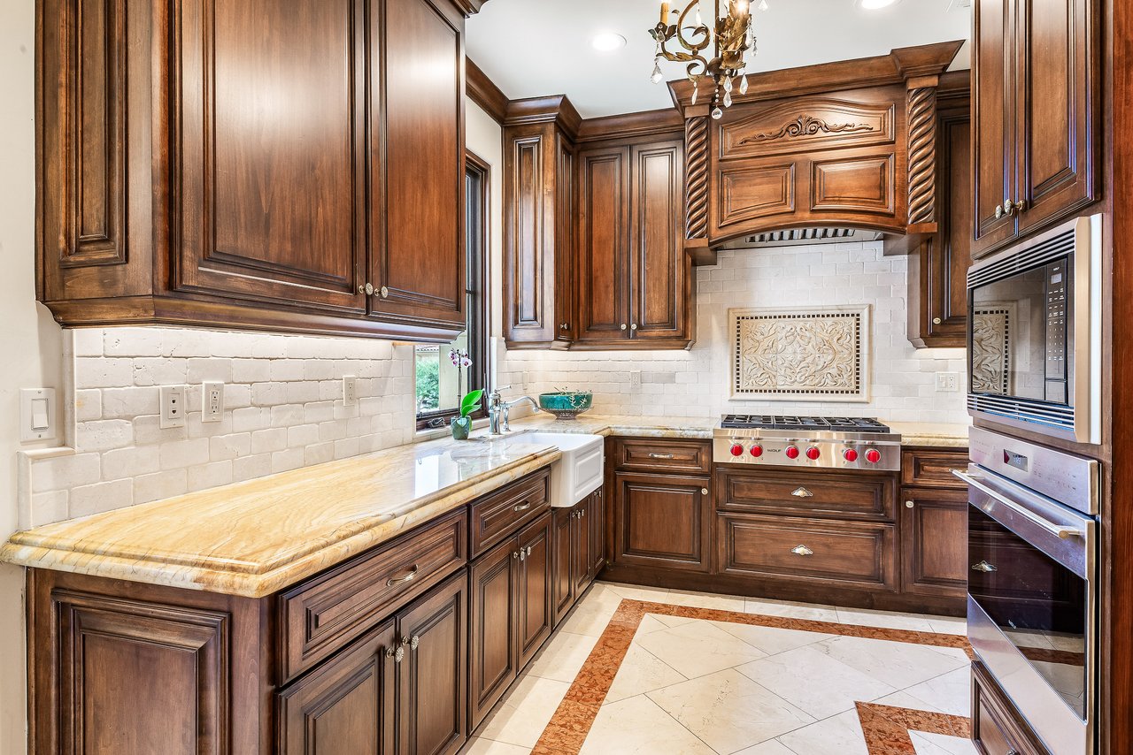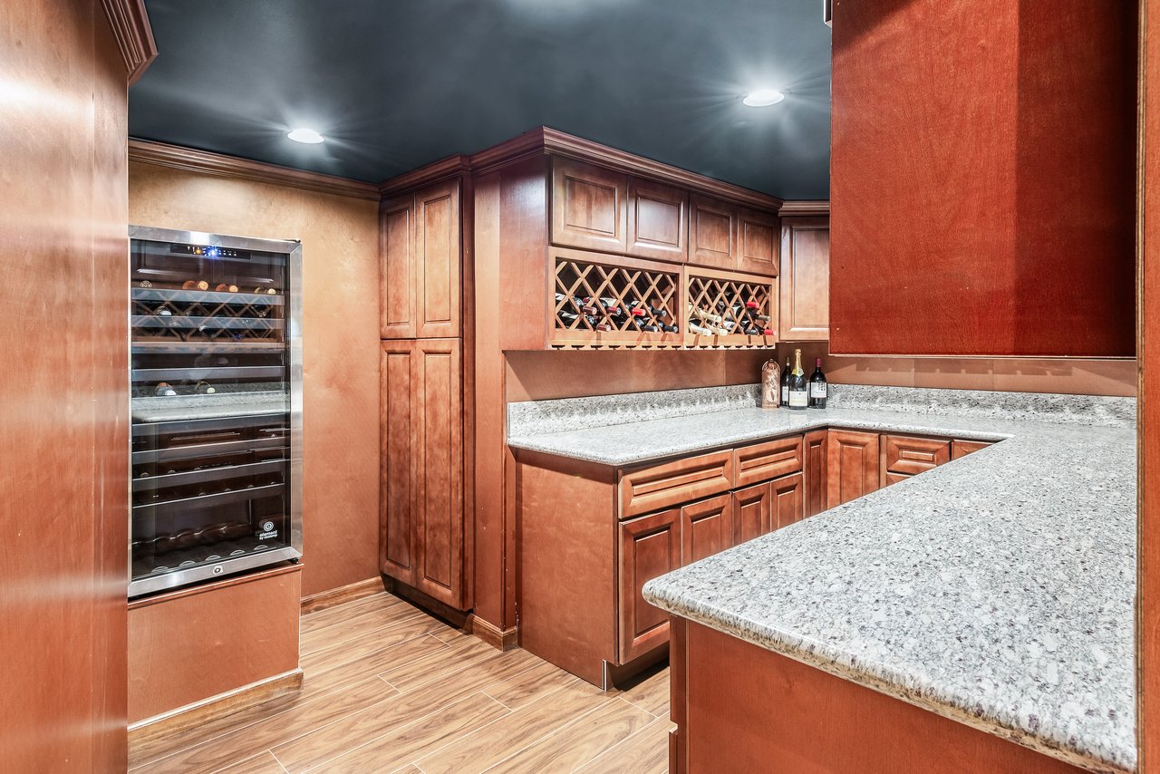 The main level offers effortless single-level living with no steps and includes the impressive primary suite with a huge walk-in closet and spa-like bathroom, a handsome library, gracious living and family rooms, and a chef's kitchen anchored by a spectacular marble island and supported by an adjacent catering kitchen.