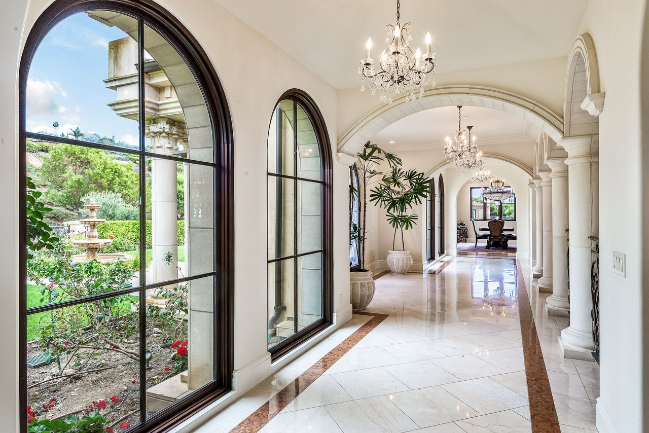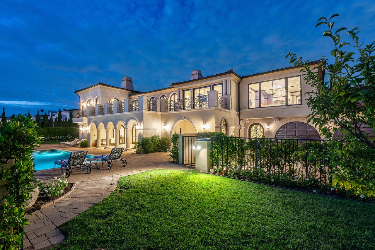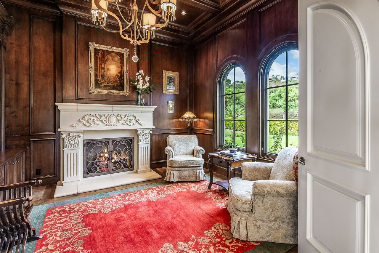 Entertaining is effortless indoors and out. The backyard is a private retreat with a resort-style pool and spa, expansive loggia, built-in BBQ, multiple grass areas, and fruit trees. On the lower level, a second family/entertaining room, four oversized bedroom suites, a private theater, space designed for a wine cellar, live-in staff quarters, and a 3-car garage with gated driveway provide unparalleled flexibility.