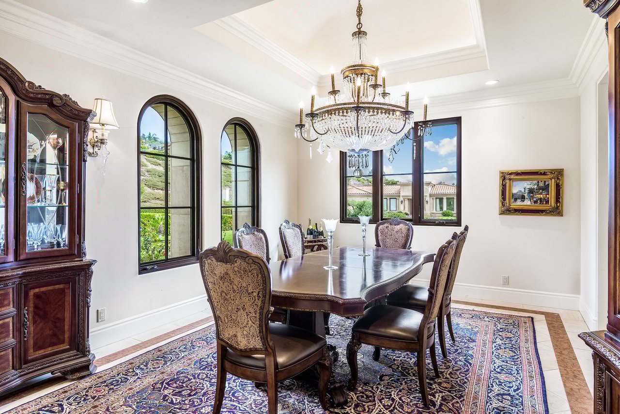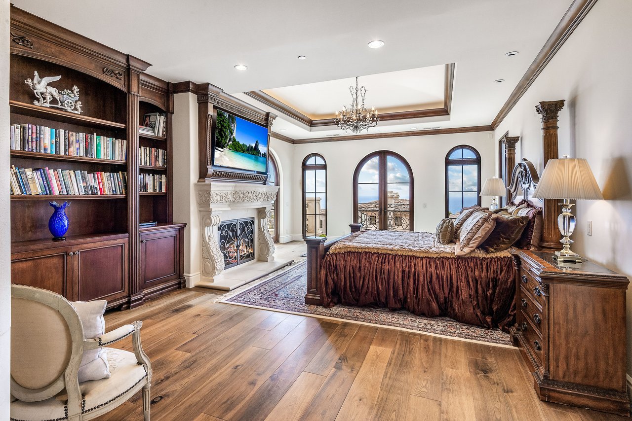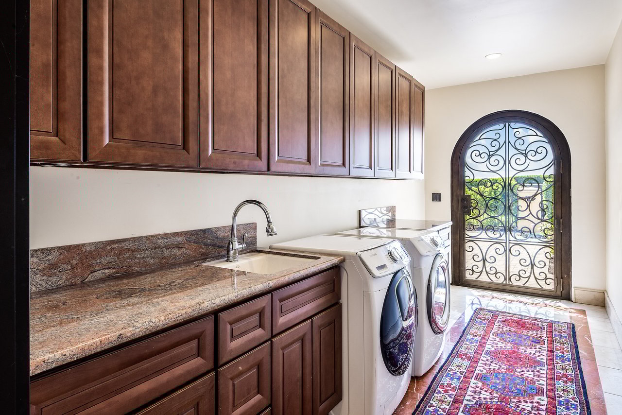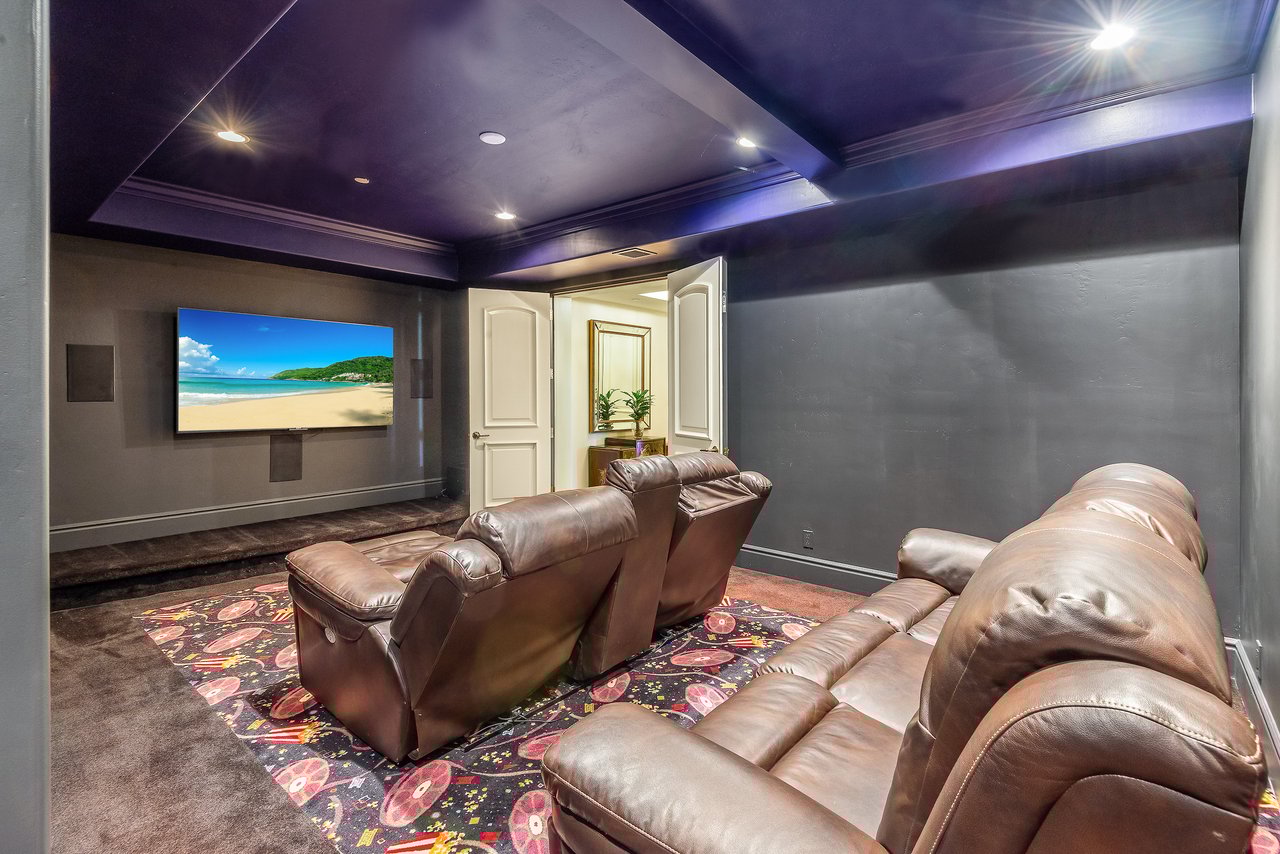 Entertaining is effortless indoors and out. The backyard is a private retreat with a resort-style pool and spa, expansive loggia, built-in BBQ, multiple grass areas, and fruit trees. On the lower level, a second family/entertaining room, four oversized bedroom suites, a private theater, space designed for a wine cellar, live-in staff quarters, and a 3-car garage with gated driveway provide unparalleled flexibility.