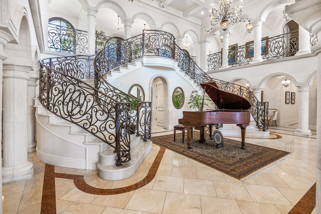 Built in 2015 with extraordinary attention to detail, this custom villa in Oceanfront Estates makes a timeless artistic statement. From the moment you step onto the oversized corner lot, the home radiates elegance while remaining warm and comfortable. The dramatic entry, framed by natural limestone columns, introduces a sweeping double staircase, Italian marble and hardwood floors, and oversized windows and doors showcasing ocean views from nearly every room.