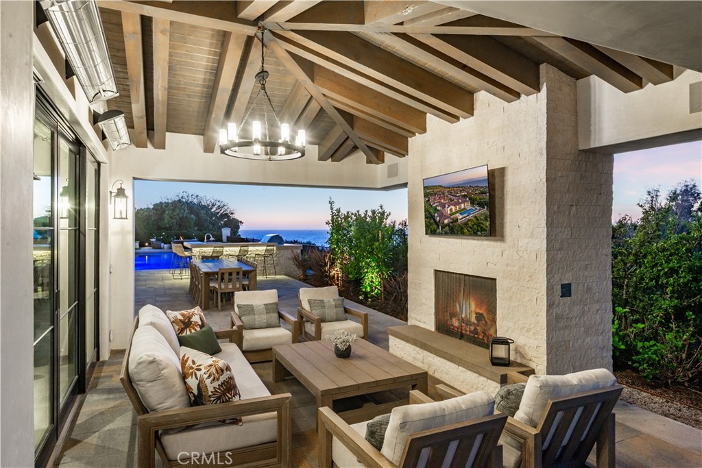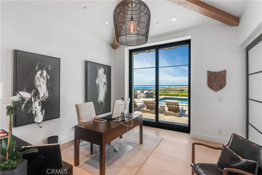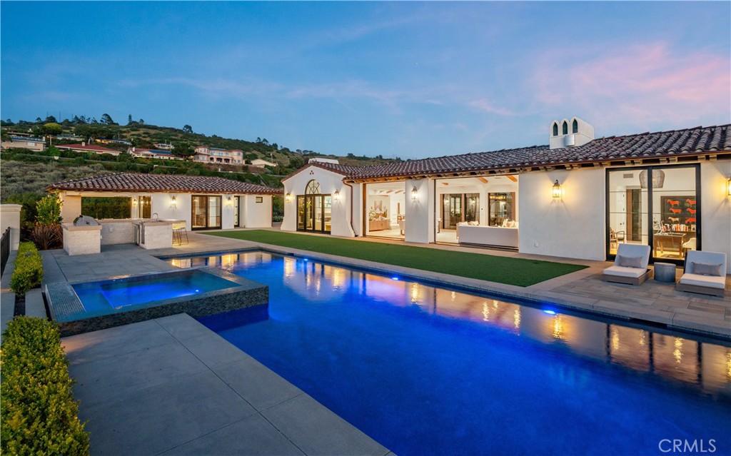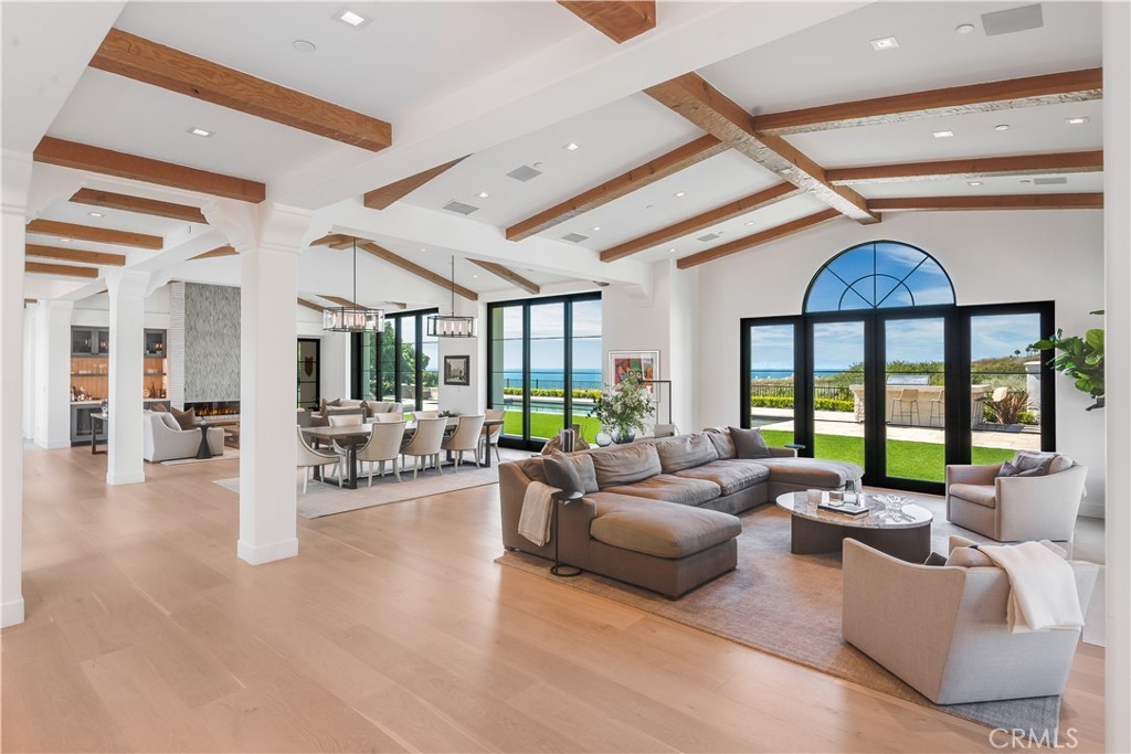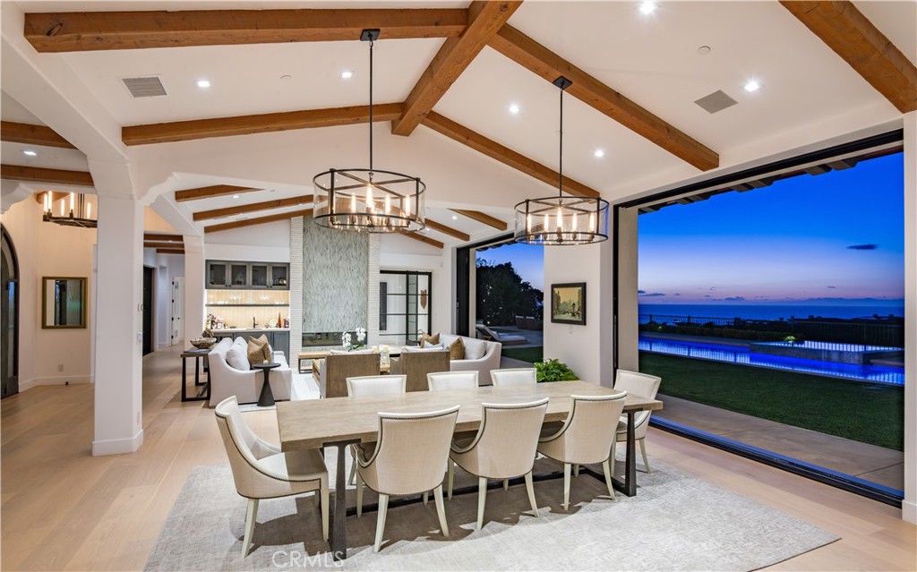 Rarely does a true one-level estate of this scale come to market, especially one with expansive ocean views. Completed in December of 2023, this custom-built residence is truly one of a kind, offering five bedrooms plus an office, six-and-a-half bathrooms, and 5,776 square feet of living space, plus two, 2-car garages on an approximately 25,000 square foot lot. A dramatic custom glass front door sets the stage. Once inside, wide-plank wood floors, exposed beam ceilings, and walls of glass fill the home with natural light while creating a seamless connection to the resort-inspired backyard. A huge saltwater pool and spa, fire pit, BBQ station, and sweeping ocean views elevate the outdoor experience, while the adjacent loggia with a fireplace offers the perfect place to unwind. The detached ADU/exercise room includes a private sauna, adding another layer of thoughtful luxury. At the heart of the home, the spectacular kitchen is anchored by a massive center island and framed by vaulted, beamed ceilings with skylights that flood the space with natural light. A chef-grade BlueStar range, Sub-Zero refrigerator, Miele dishwashers, custom cabinetry, and quartz counters complete the space. Each bedroom enjoys an ensuite bathroom, and a beautifully positioned office takes full advantage of the ocean views. State-of-the-art amenities include an ELAN home automation system, Lutron lighting, and built-in speakers throughout the home and outdoor spaces. A unique opportunity to enjoy single-level living, exceptional design, along with expansive ocean views.