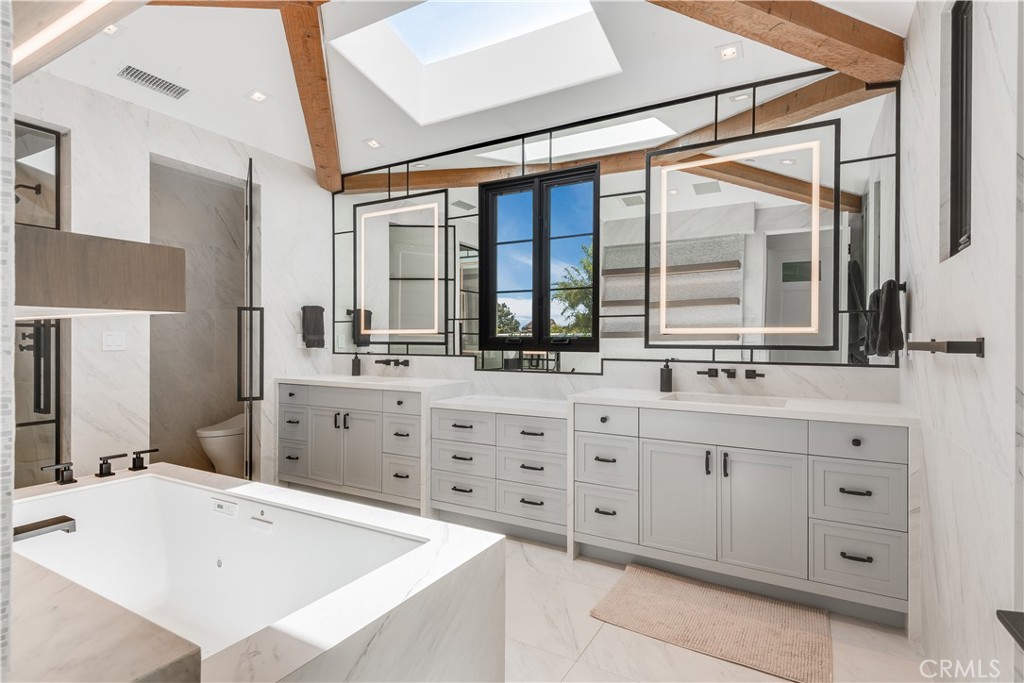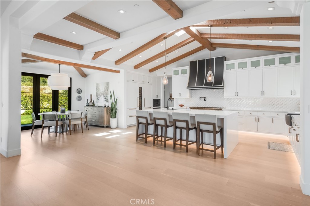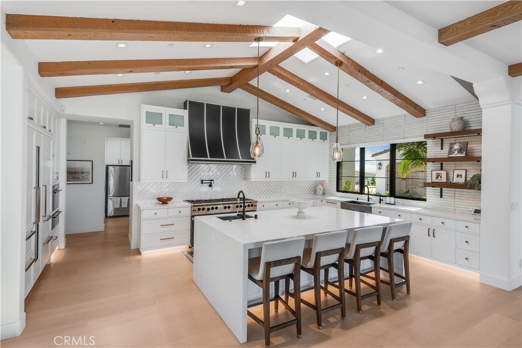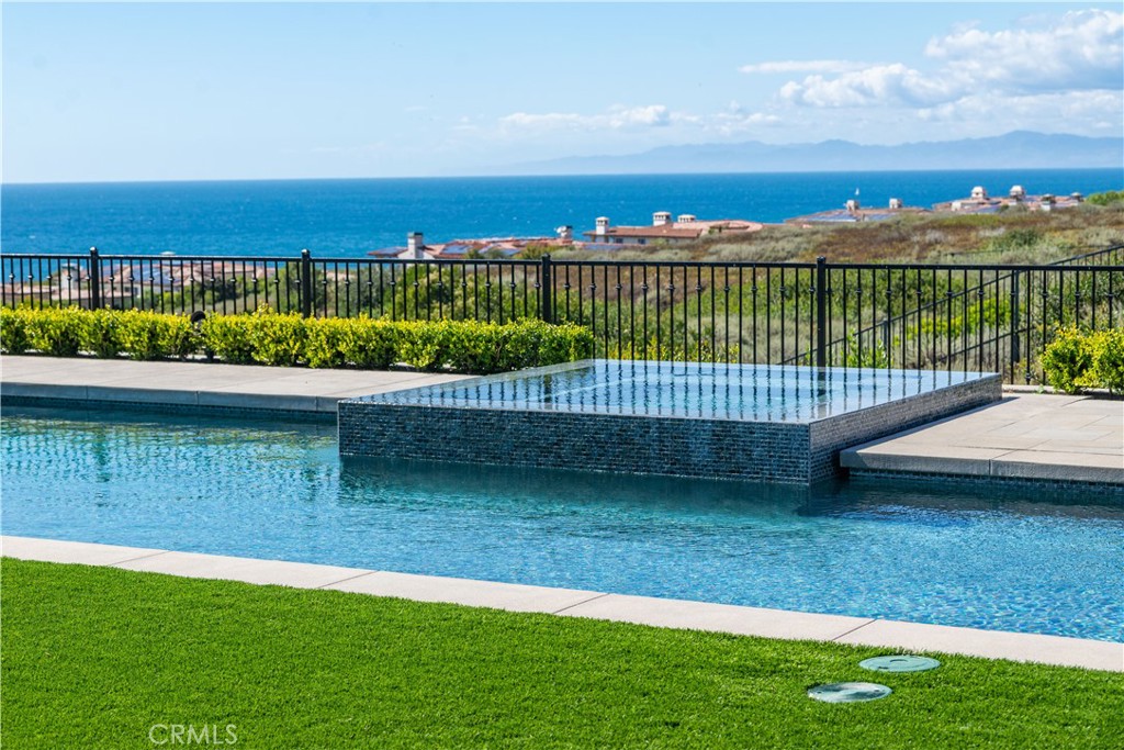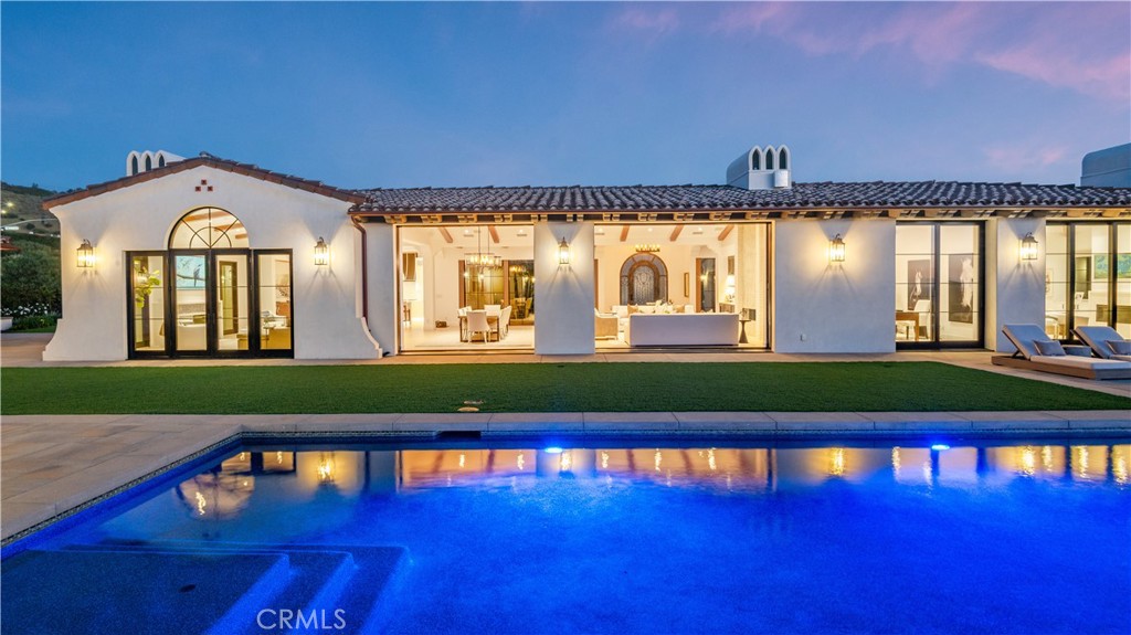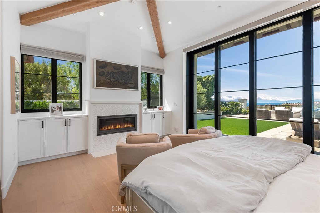 Rarely does a true one-level estate of this scale come to market, especially one with expansive ocean views. Completed in December of 2023, this custom-built residence is truly one of a kind, offering five bedrooms plus an office, six-and-a-half bathrooms, and 5,776 square feet of living space, plus two, 2-car garages on an approximately 25,000 square foot lot. A dramatic custom glass front door sets the stage. Once inside, wide-plank wood floors, exposed beam ceilings, and walls of glass fill the home with natural light while creating a seamless connection to the resort-inspired backyard. A huge saltwater pool and spa, fire pit, BBQ station, and sweeping ocean views elevate the outdoor experience, while the adjacent loggia with a fireplace offers the perfect place to unwind. The detached ADU/exercise room includes a private sauna, adding another layer of thoughtful luxury. At the heart of the home, the spectacular kitchen is anchored by a massive center island and framed by vaulted, beamed ceilings with skylights that flood the space with natural light. A chef-grade BlueStar range, Sub-Zero refrigerator, Miele dishwashers, custom cabinetry, and quartz counters complete the space. Each bedroom enjoys an ensuite bathroom, and a beautifully positioned office takes full advantage of the ocean views. State-of-the-art amenities include an ELAN home automation system, Lutron lighting, and built-in speakers throughout the home and outdoor spaces. A unique opportunity to enjoy single-level living, exceptional design, along with expansive ocean views.